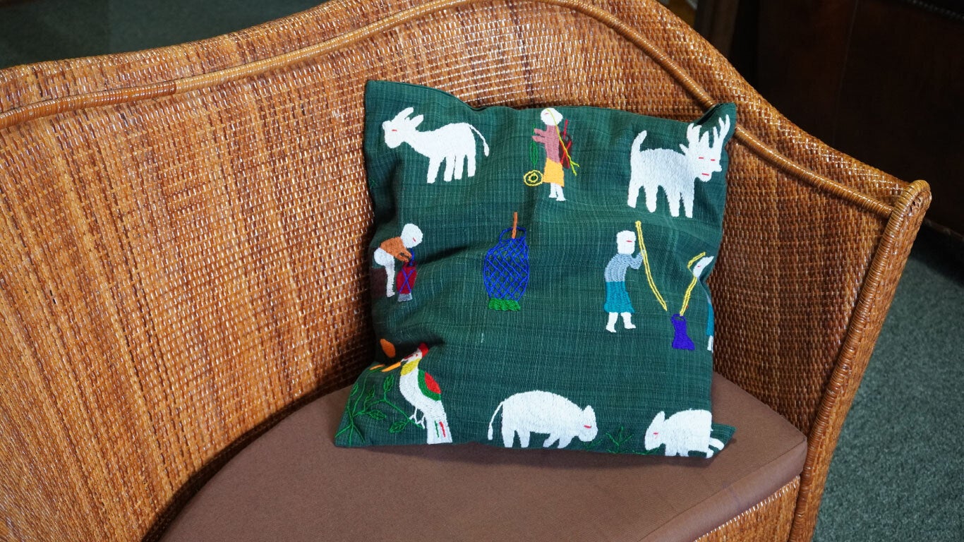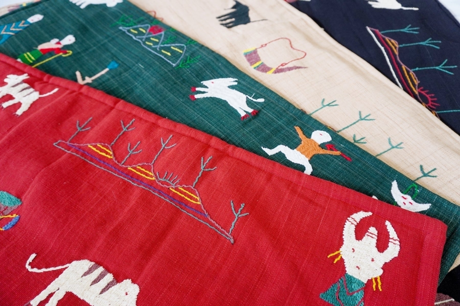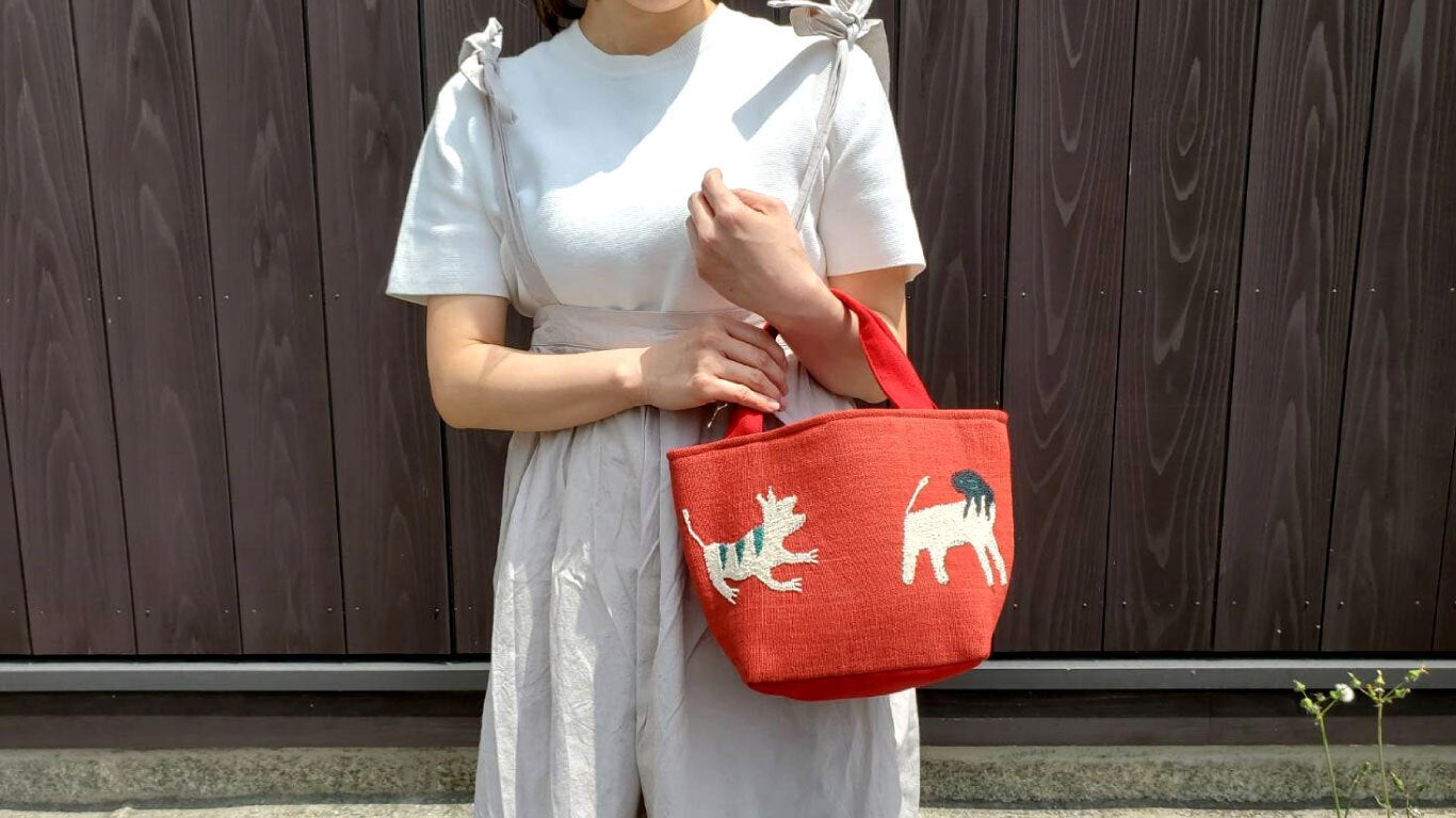 赤いトートバッグを注文した者です。 刺繍がかわいくて魅力的なのはもちろんのこと、生地や糸の色合いがカラフルでありながら自然な落ち着いた雰囲気でとても気に入っています。 もったいない様な気がして、まだトートバッグとしては使用しておらず壁にかけて飾っていますが、この動物は何の動物だろう?これはひょうたんの水筒だろうか、など色々想像できて見飽きないです。 自分は飾っちゃっていますが、生地もしっかりしていて中と外にひとつずつポケットもついている丁寧な作りなので、トートバッグとしてもとても使いやすそうだと思います。 本当にまだまだ色々な情勢が落ち着かない状態ですが、改めて今回のプロジェクトを実施して頂き、ありがとうございました。