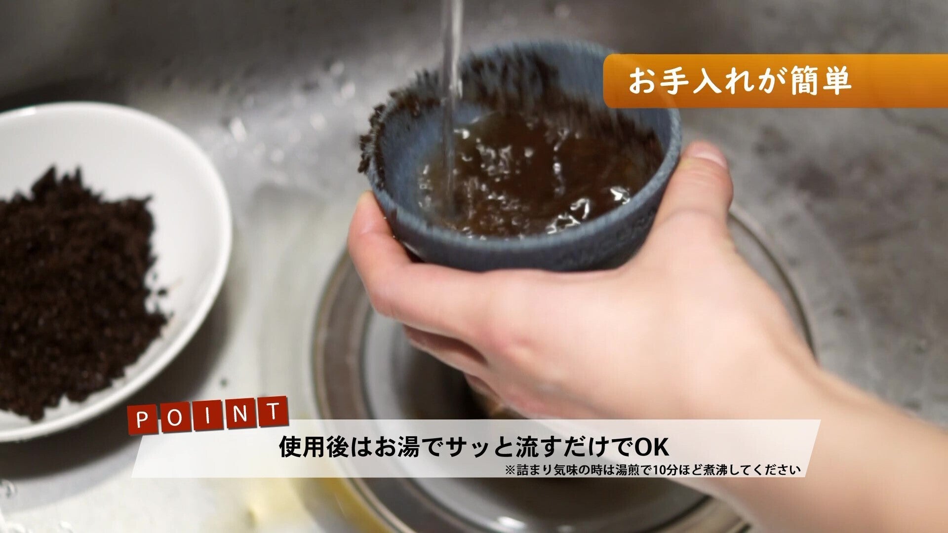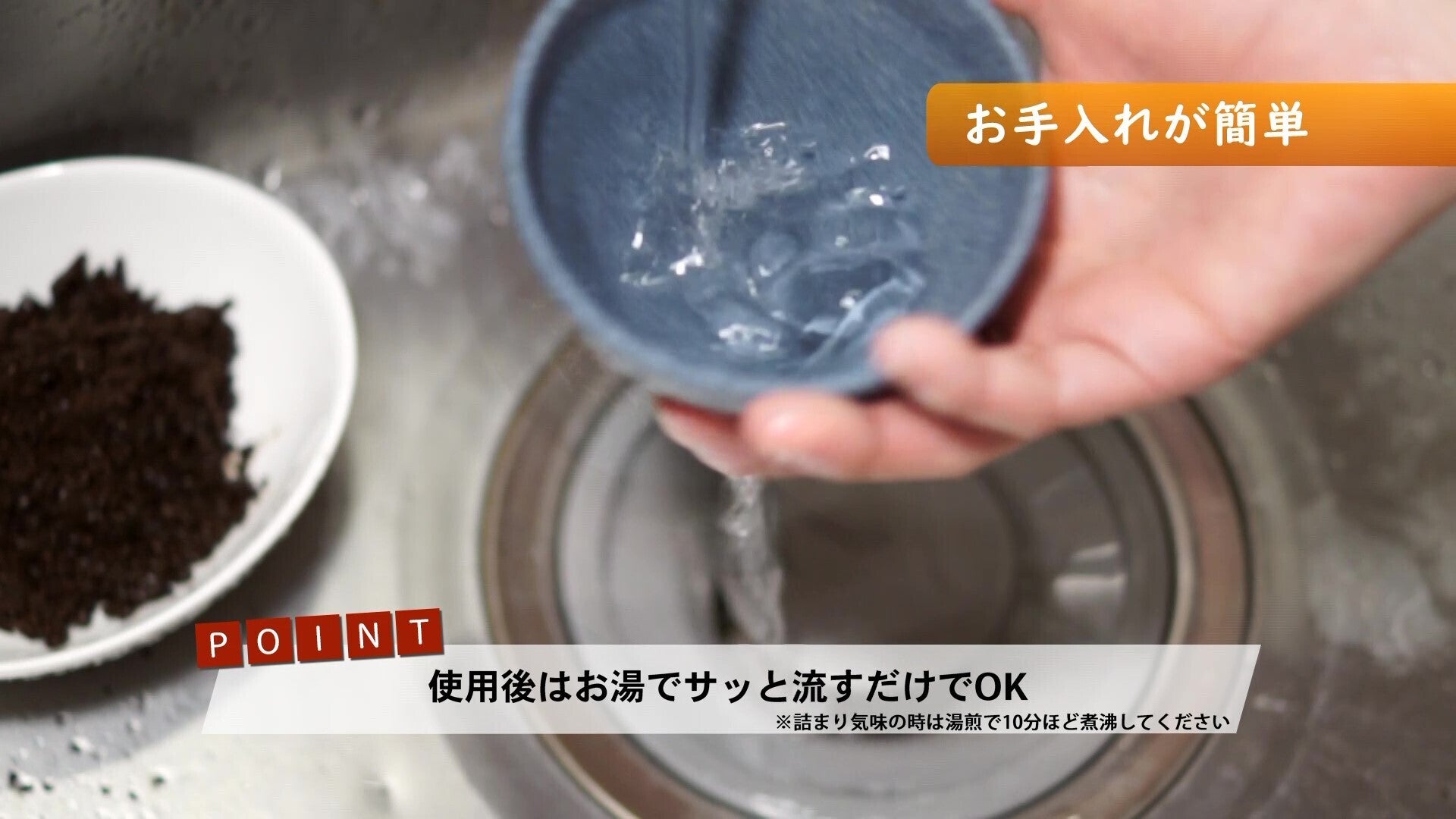 A: シンクにそのまま流して濯いでください。排水溝にネットを被せておけばコーヒー豆が生ゴミの臭い消しにもなります。
