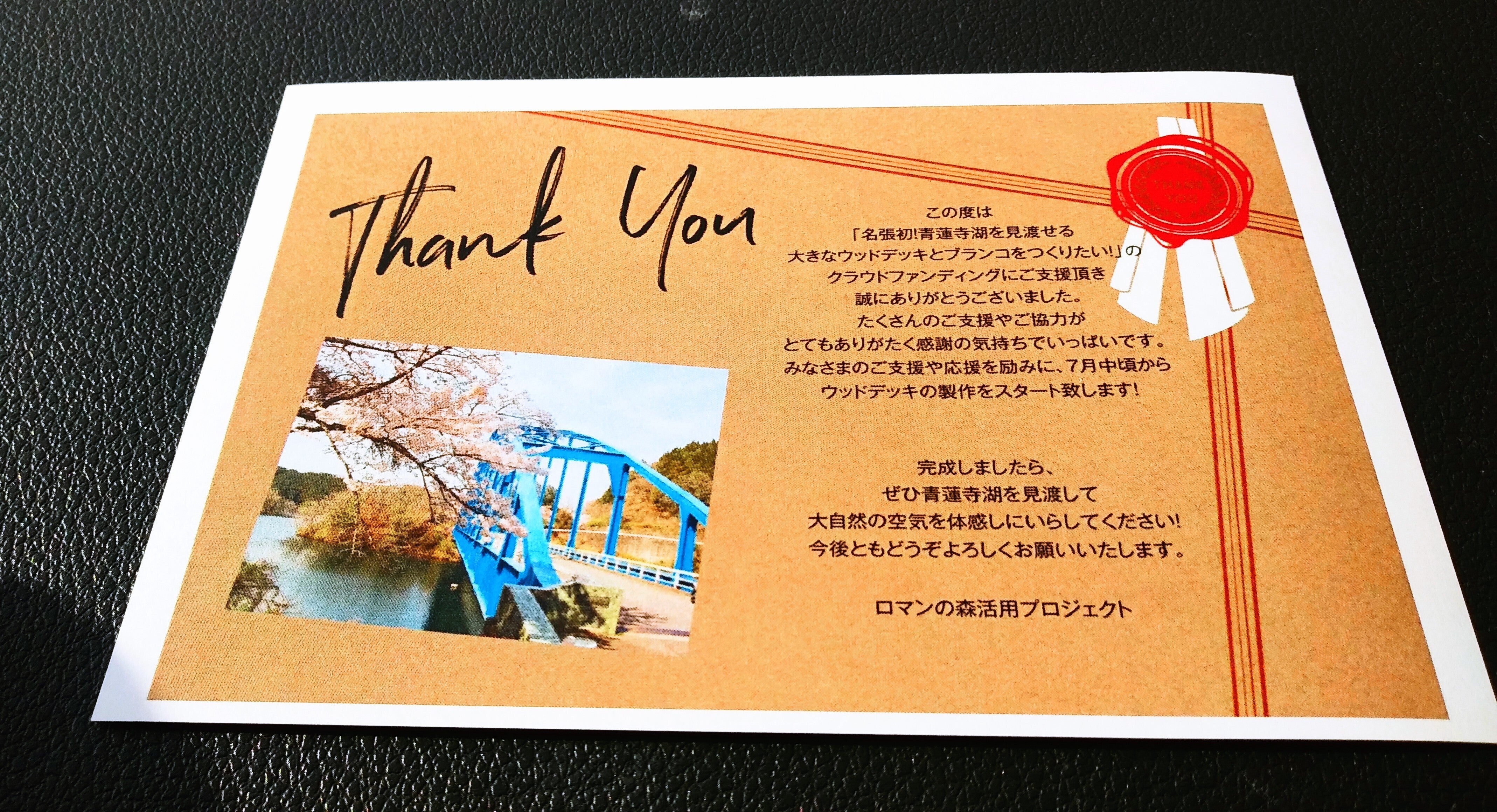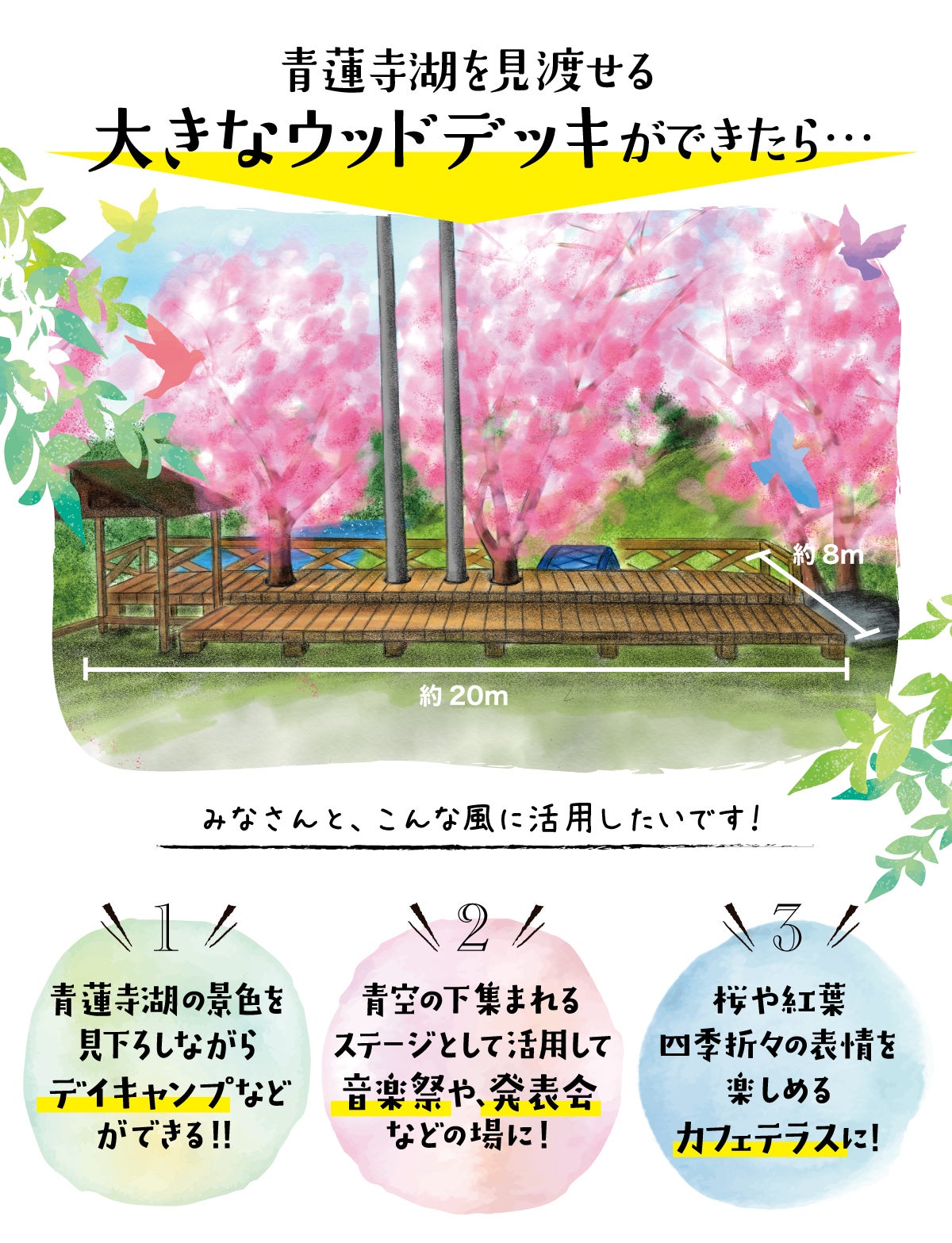 青蓮寺湖を見渡せる高台に大きなウッドデッキブランコをつくって、ご家族連れ、お子様たちと、わんちゃんも一緒に、「青蓮寺ロマンの森」がもっともっと皆様に愛される場所となっていきますように・・・どうか皆さまの温かいご支援をよろしくお願いいたします!