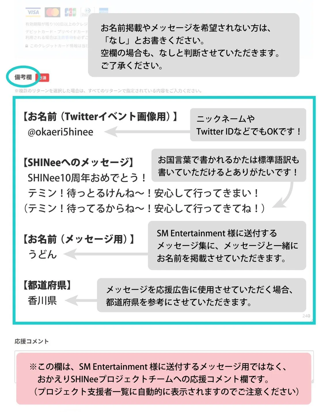 プロジェクト終了後に、みなさまからのメッセージをひとつにまとめて本国SM Entertainment様にお送りします。また、頂いたメッセージの中から一部は、広告に使用される場合があります。予めご了承ください。