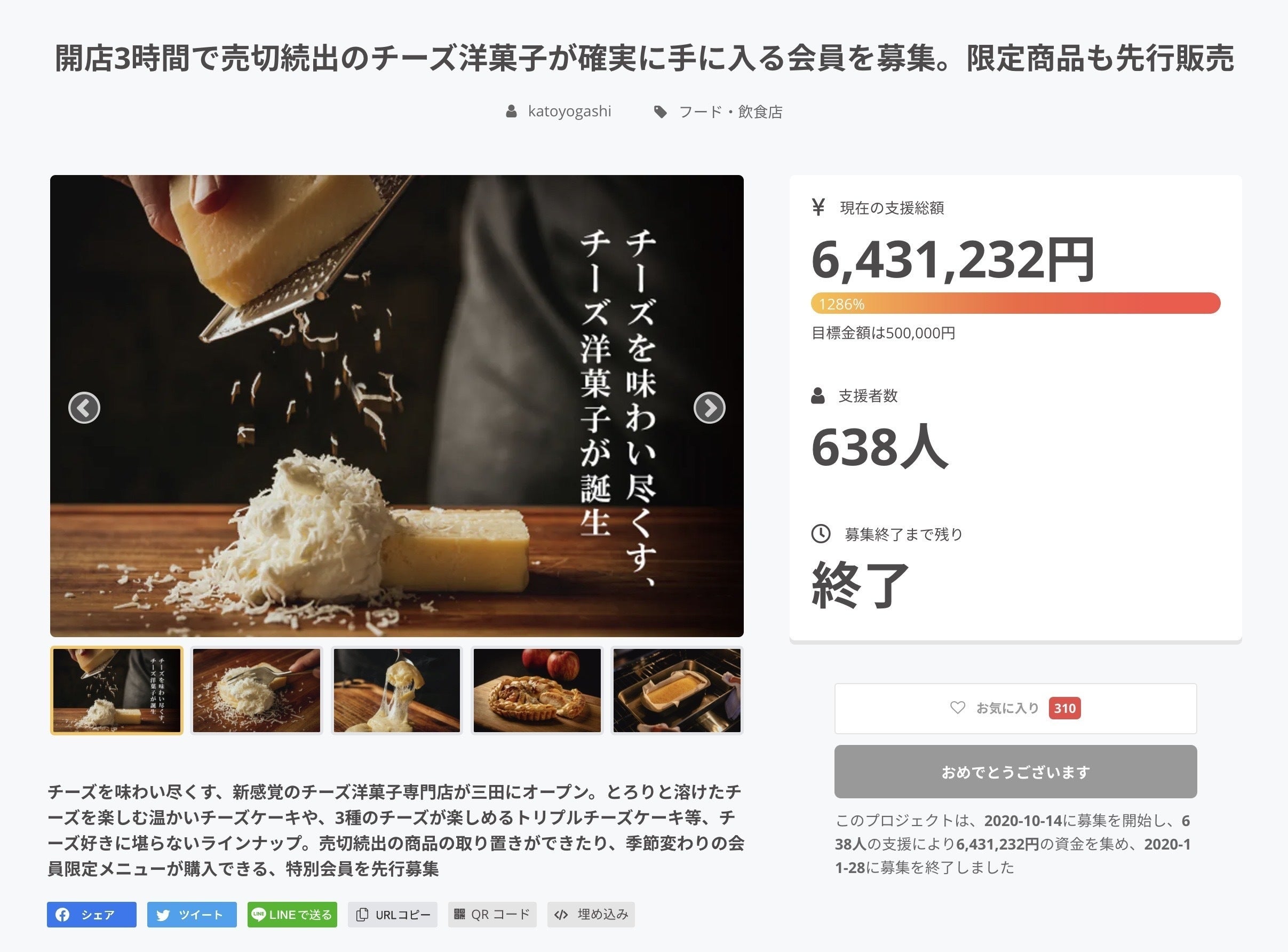 当店「加藤洋菓子」は、チーズの良さを最大限に引き出した、チーズ洋菓子専門店として、新店オープン時にCAMPFIREに挑戦しました。