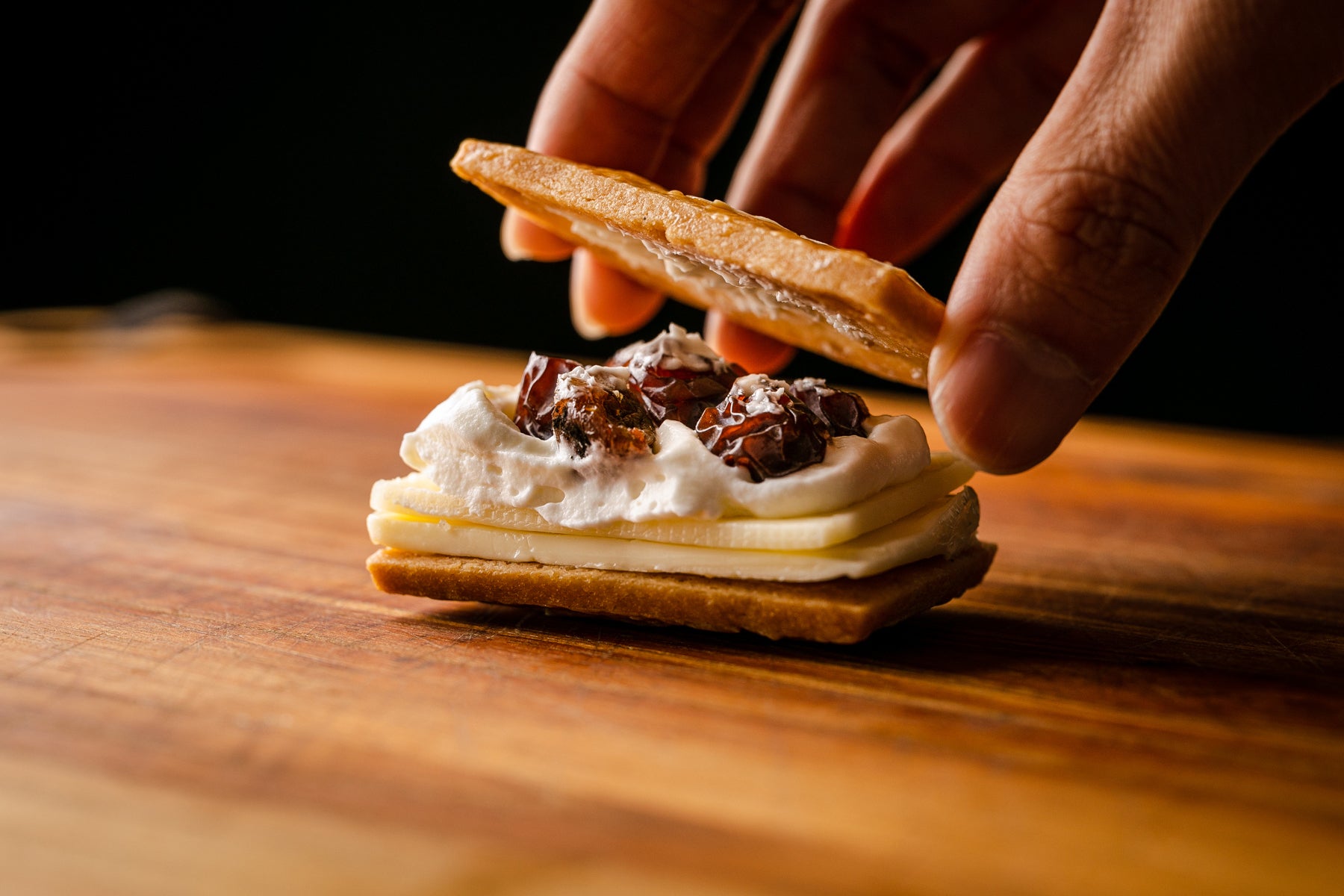 そこにアクセントとして、塩味の強いデンマークのスライスチーズも挟み込みます。