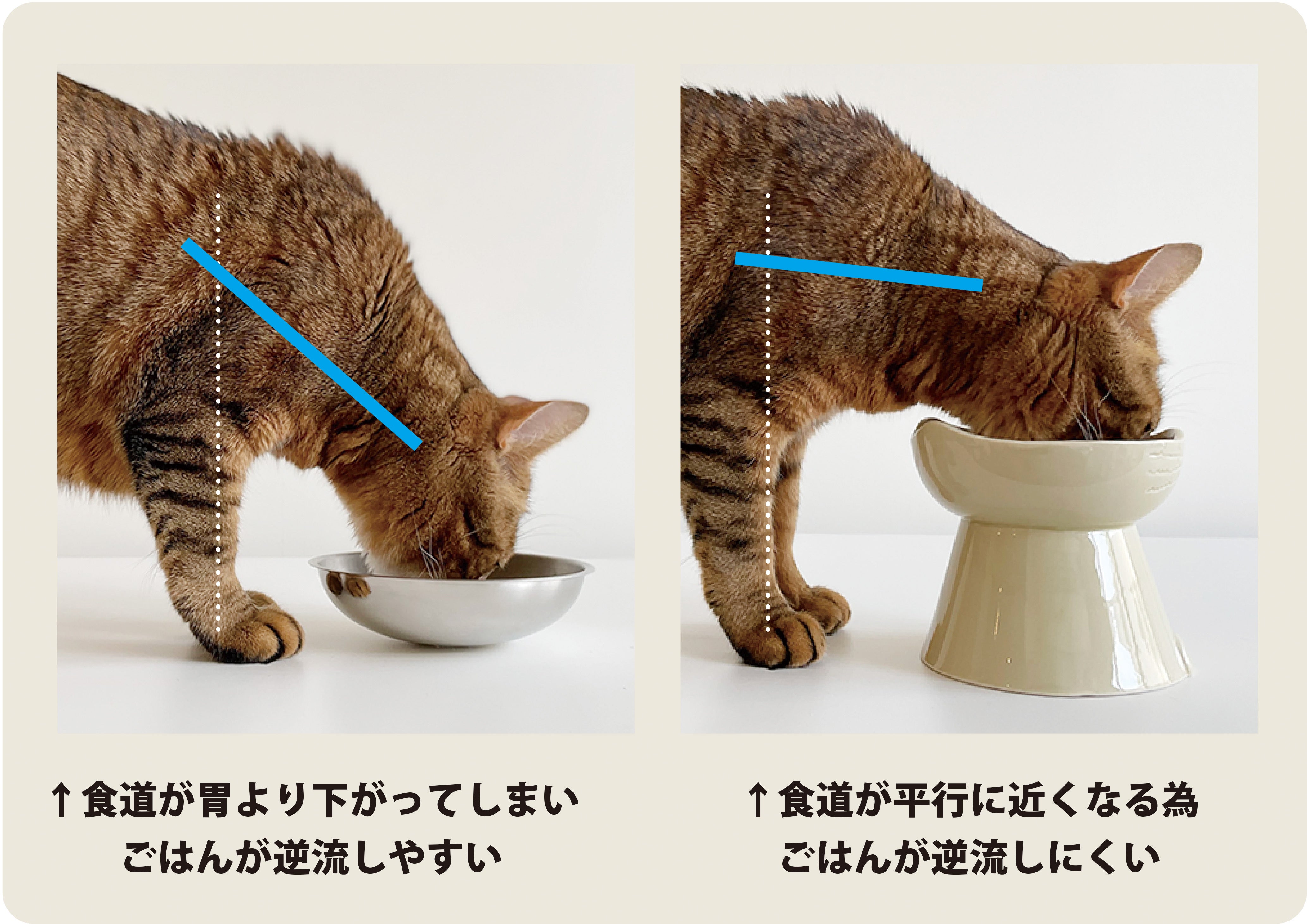 低い食器でごはんを与えていると食道が胃より下がってしまい、ご飯が逆流しやすく、食後の吐き戻しにつながります。