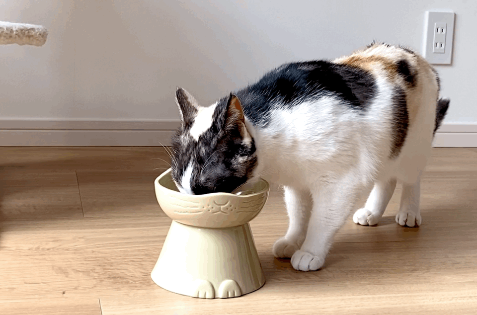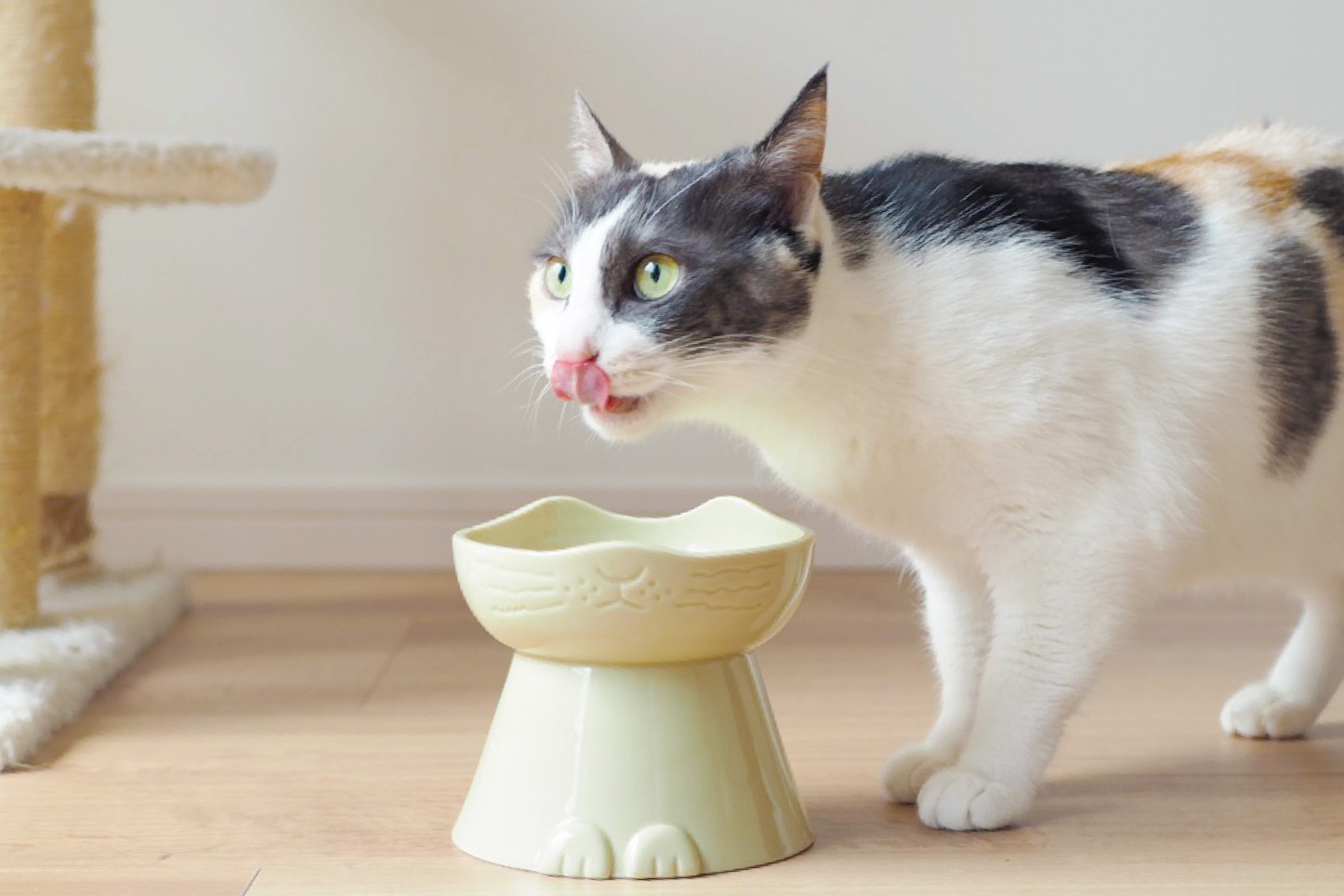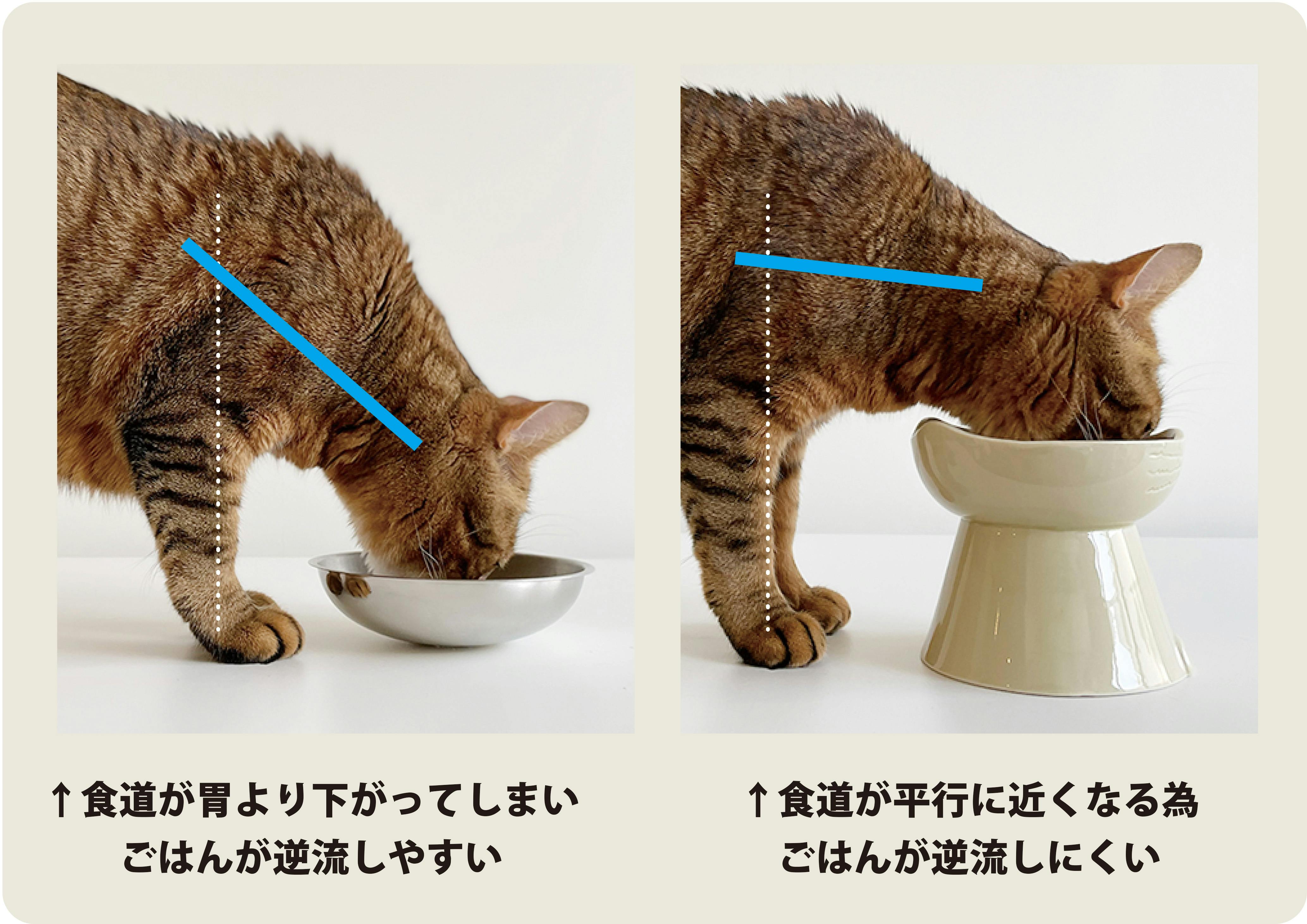 ・高さのあるうつわで食事をさせることで食べこぼしや首が下がる のを防ぎ、ネコの吐き戻しを軽減します。