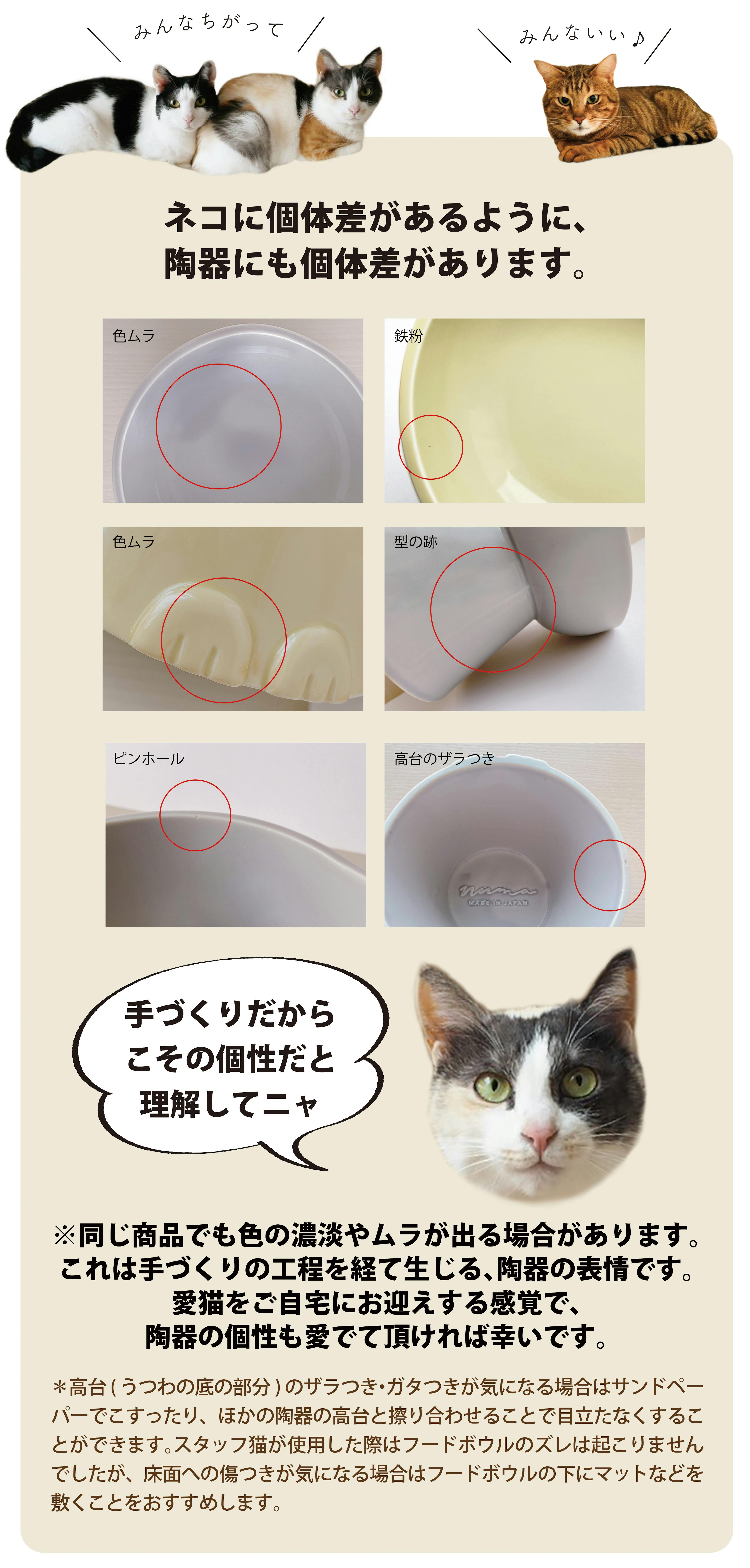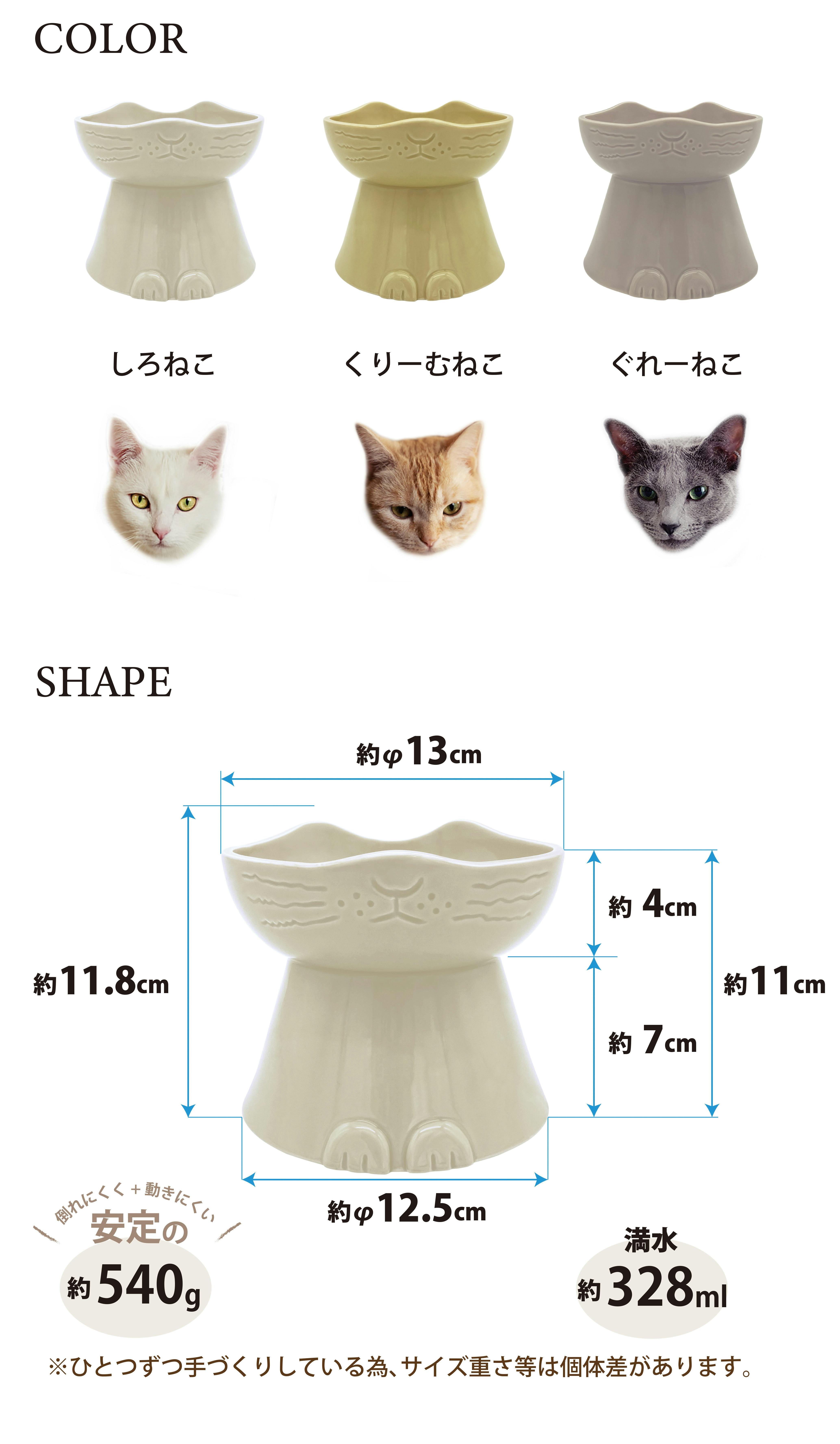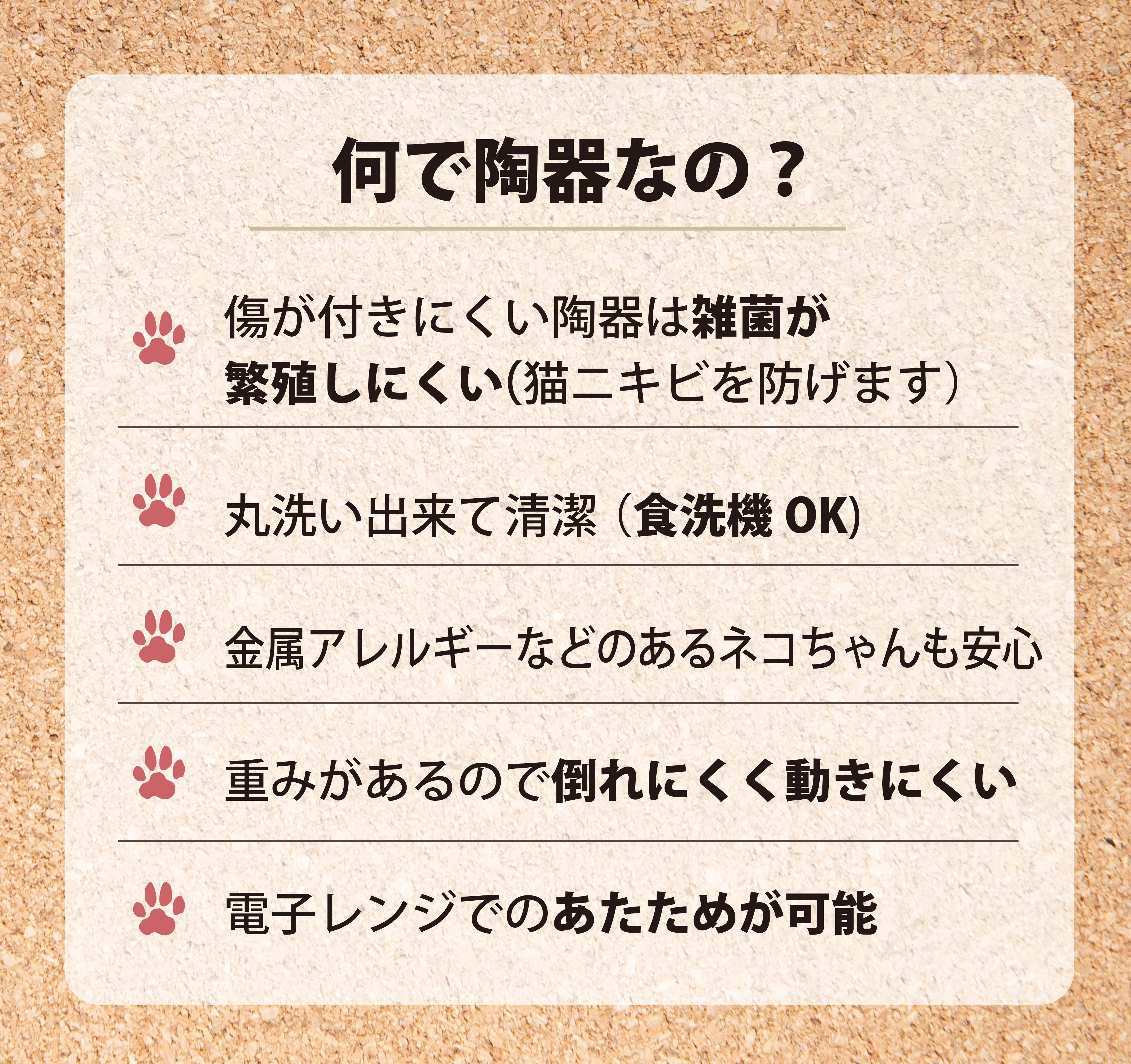 ・高さのあるうつわで食事をさせることで食べこぼしや首が下がる のを防ぎ、ネコの吐き戻しを軽減します。