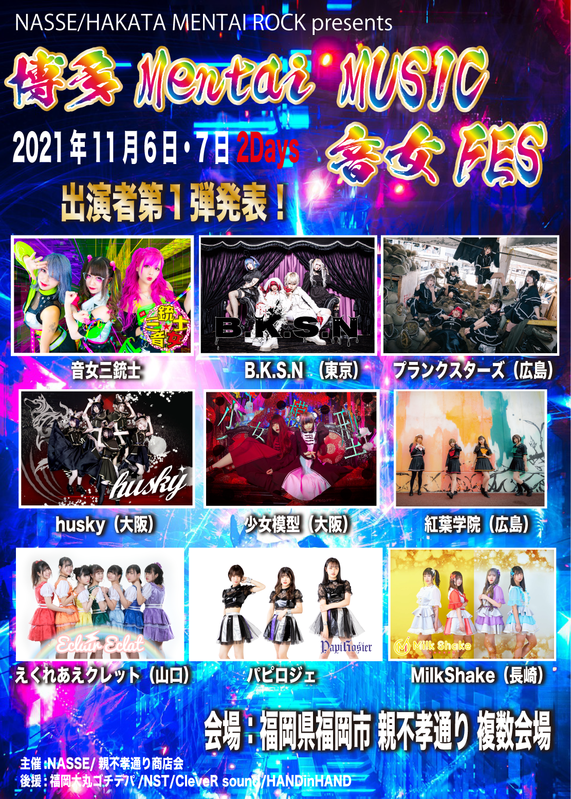 リターン品にもなっております「博多MENTAI MUSIC音女FES」の情報がついに解禁!!公式Twitterや公式HPも公開となりました!【公式Twitter】【特設HP】そして、第一弾出演者が発表に。音女三銃士B.K.S.N(東京)プランクスターズ(広島)husky(大阪)少女模型(大阪)紅葉学院(広島)えくれあエクレット(山口)パピロジェMilkShake(長崎)以上、9組。他出演者も随時発表していきます。お楽しみに‼「博多MENTAI MUSIC音女FES」1Daysチケット5,000円分が4,000円でゲットできるリターン品もあります。ぜひ、引き続きご支援お願いします。◇◆--------------------------------------「博多MENTAI MUSIC音女FES」日時:2021年11月6日(土)・7日(日)会場:親不孝通り複数会場時間:各会場OPEN12:00--------------------------------------◇◆