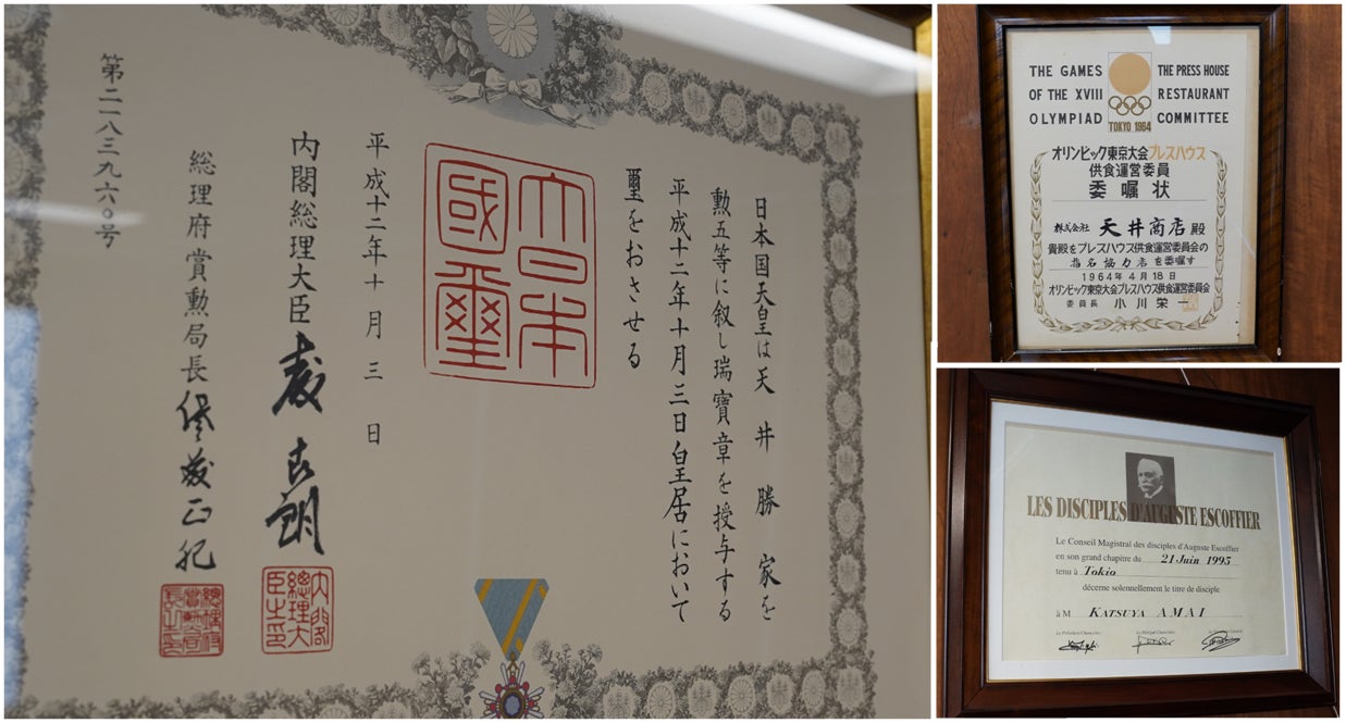 天皇より瑞宝章/ 東京オリンピックへの納入実績/エスコフィエ協会より感謝状