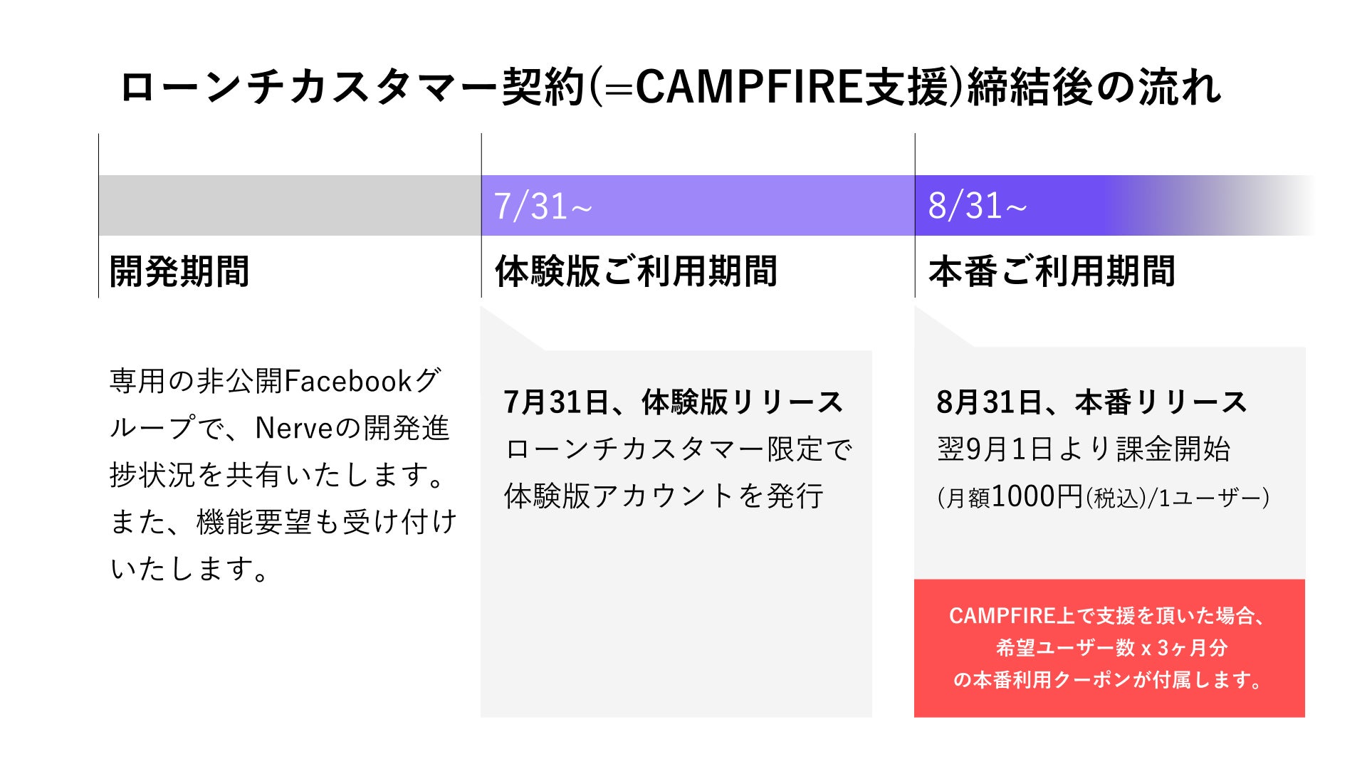 今回ご支援頂きローンチカスタマーとなって頂いた方には、専用の非公開Facebookグループでの開発進捗報告、機能要望の受付、本番リリース1ヶ月前の7月末に体験版アカウントの発行をさせて頂く予定です。また、CAMPFIRE上で支援を頂いた場合、希望ユーザー数 x 3ヶ月分の本番利用クーポンが付属します。