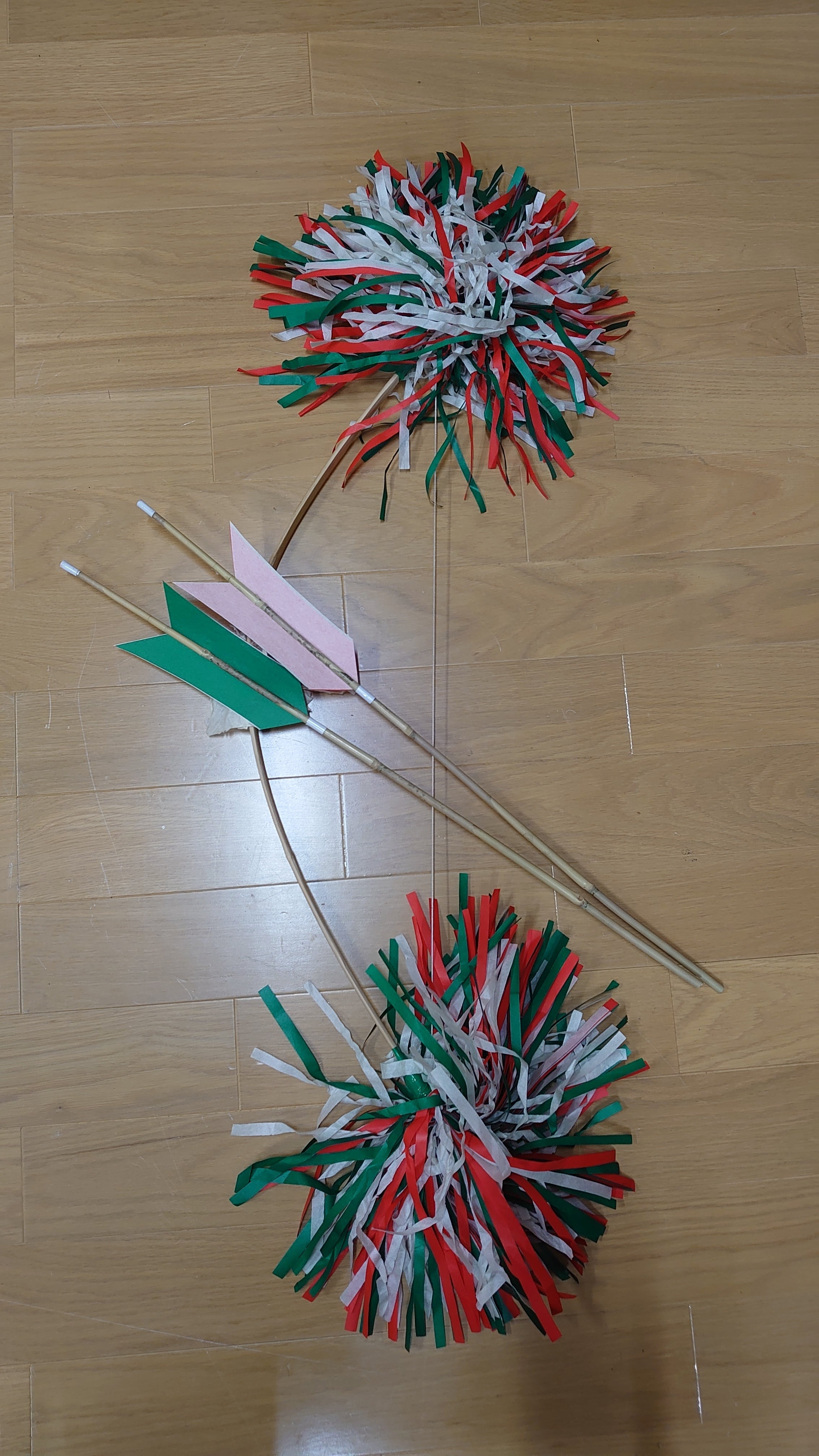 2022/02/21 00:06続きの道具作りです!これは弓矢の矢の紙になります!これとセットで使うのが弓です。うちの社中では、この弓矢のセットと鬼棒を1公演に演目にもよりますが、2セット作ります!あとは御幣と言うのを2セット作ります!祭りやイベントの後には欲しい方に配って帰りますので、毎回皆で手分けして竹を切って削ったり紙を切ったりして作ります。これは御幣の作ってる動画を撮ってみたものです!https://youtu.be/HFwVxyKCIQsこんな感じで今日は竹を切って削ったりしてなかったので、紙だけ切り終了です。 もっと見る