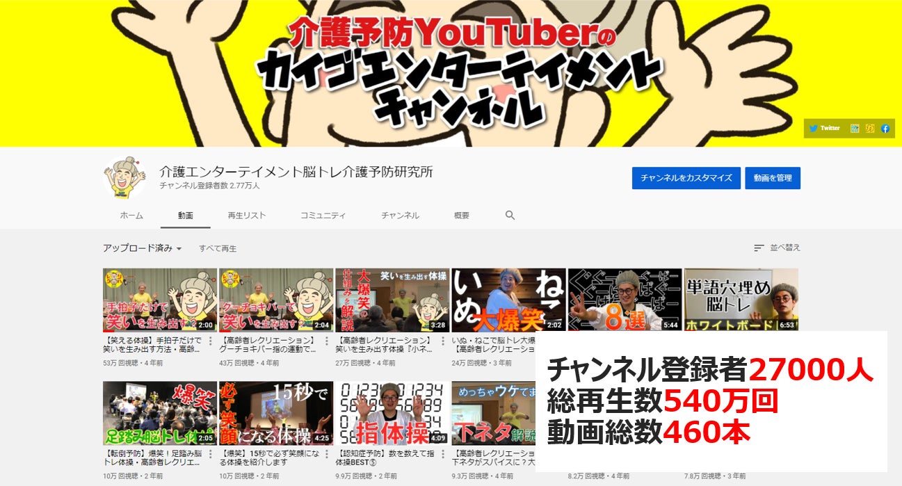 YouTubeの「介護エンターテイメントチャンネル」は、高齢者の皆様、介護施設職員の皆様に大人気で、登録者数27,000人、動画アップ数は460本、延べ再生回数は540万回になりました。※2021年5月現在