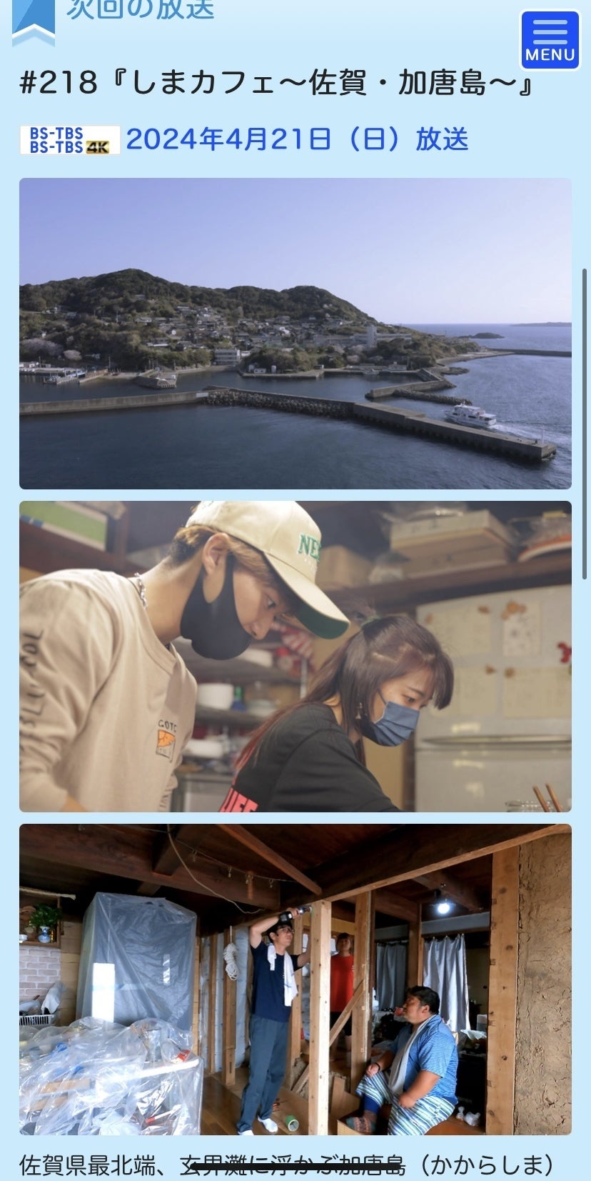 2024/04/21 09:34ご支援者の皆様ご無沙汰しております! Selfish 加唐島Caféの井川えりなです。ご報告がございます。とうとうSelfish、おかげ様で全国放送デビュー致します!内容は以前放送された1時間番組が 九州から始まり、関東、そしていよいよ全国に放送される!ことになりました!4/21(日) 10:00〜BS−TBS ドキュメントJ#218 「しまカフェ」ご報告が当日、しかも今から30分後のお知らせになり大変申し訳ないのですがよかったら是非ご覧ください!今後も張り切って頑張って参ります。どうぞよりしくお願い致します! Selfish 加唐島Café もっと見る