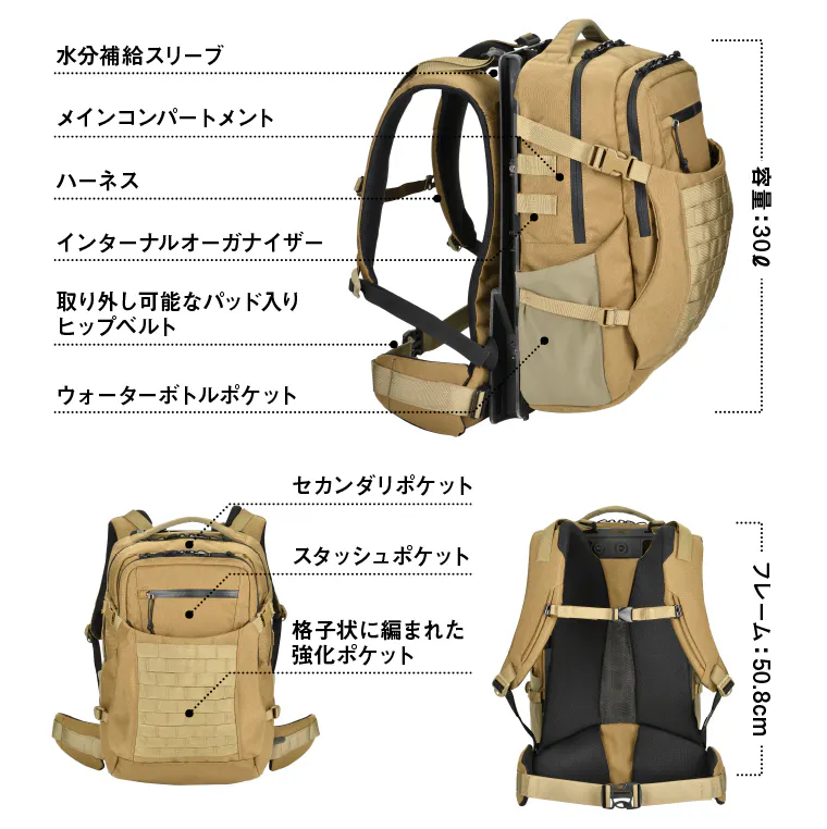 ・30ℓの容量で、1日に必要なギア、食べ物、衣類を収納できます。