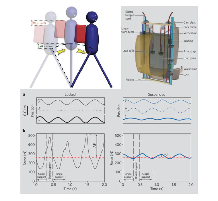 ペンシルベニア大学の生物学の教授であり、筋肉機能と生体力学の専門家であるローマ博士は、歩行者に対して荷物を上下に動かすことができる吊り荷技術(SLT-Suspended Load Technology)を発明しました。