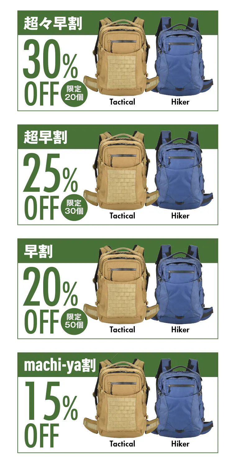 今回紹介するHoverGlideの“TACTICAL(タクティカル)” と“HIKER(ハイカー)”は、容量30ℓとハイキング、トレッキングだけでなく、街にもフィットするサイズなので、通勤や街歩きにもオススメです。