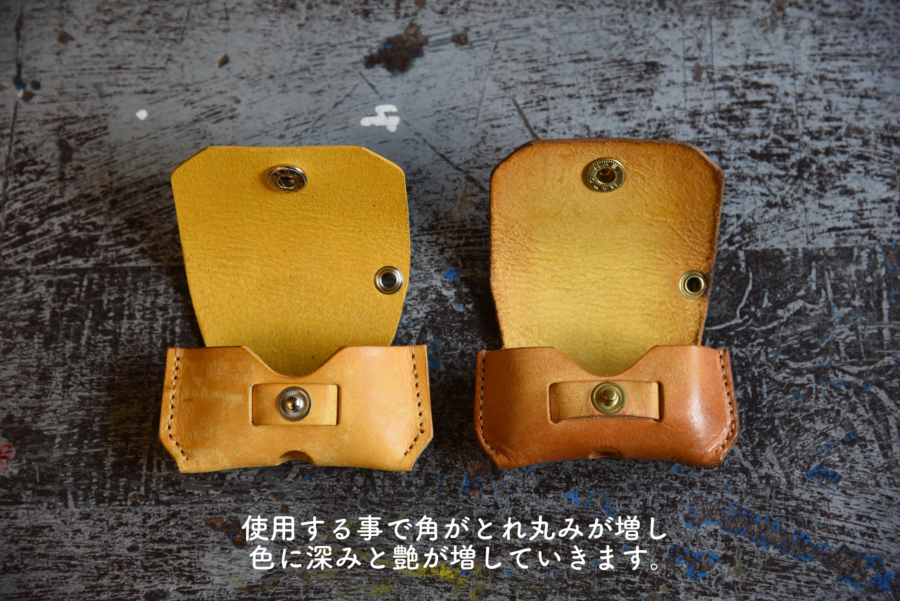 雨や飲み物などの水分に気をつけ使用することで艶が増し、飴色に変化していきます。もちろん軽いメンテナンス(オイルやミツロウで磨く等)することでより一層美しく、革好きが唸る変化をしてくれます。