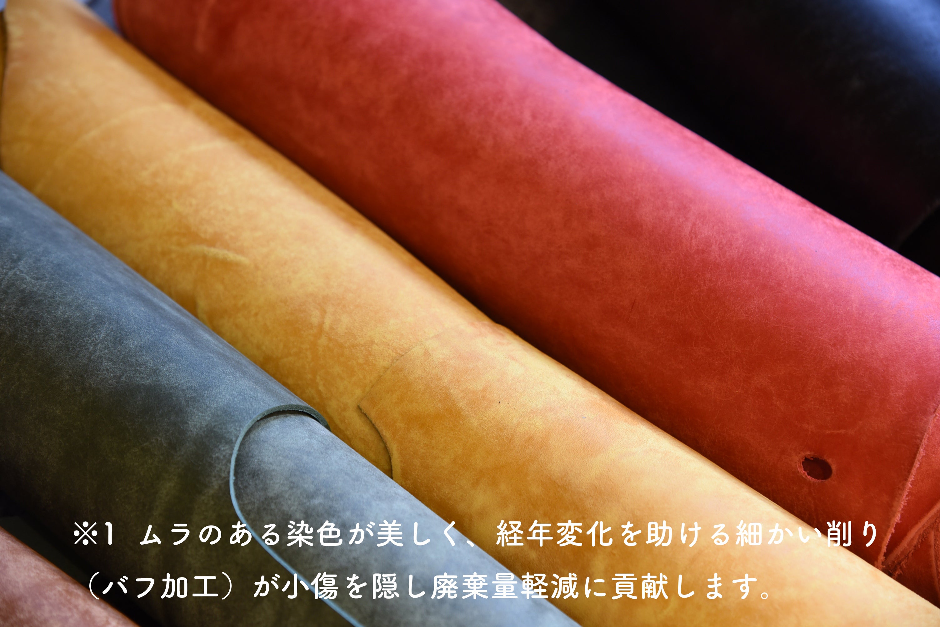 しかし、今回使う革は、※1特殊な加工(微細な毛羽立ち)を施しているため、小さい傷が目立ちにくく、廃棄する量を減らすことに貢献しています。