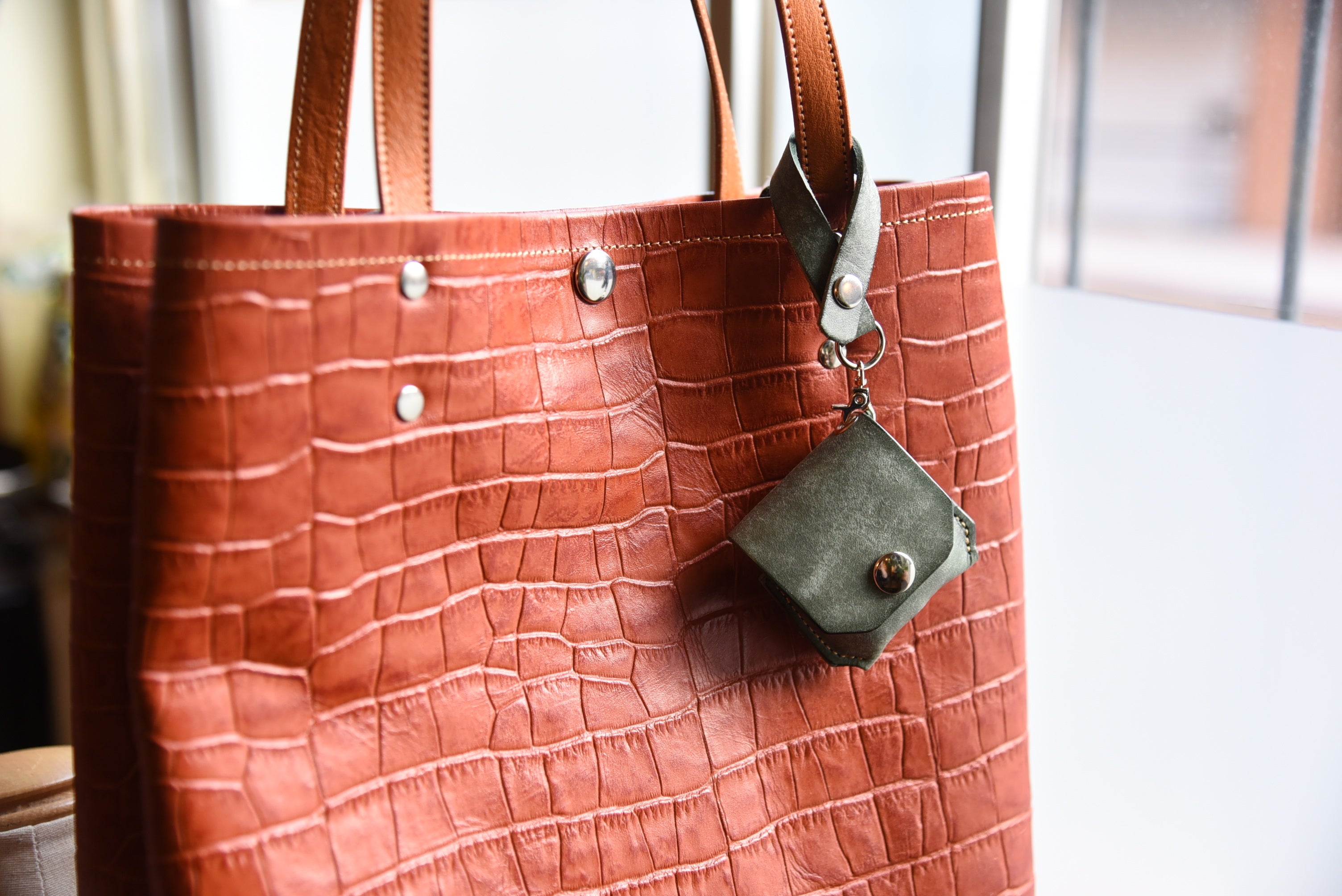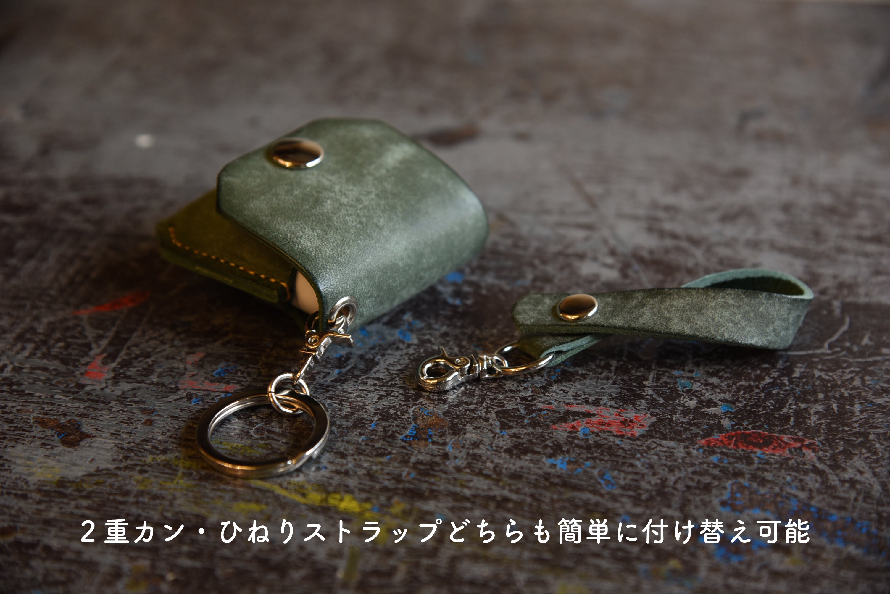 2重カンでキーホルダーのように使用する場合と、ひねりストラップで鞄にぶら下げる2通りの使い方が出来ます。また、鍵と合わせることが多いと想定しシルバー色(ニッケル)の金具に統一致しました。