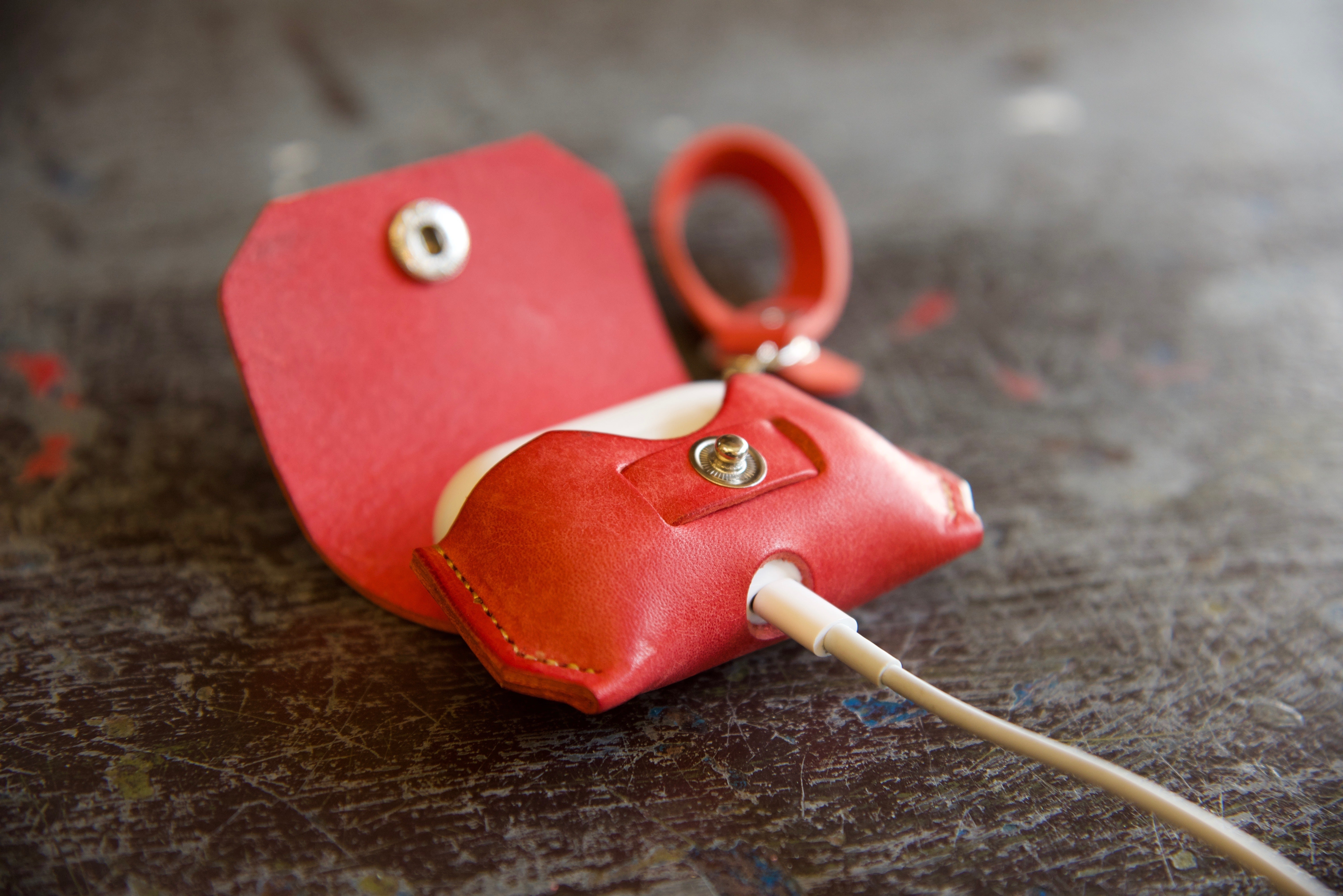 AirPodsケースに直接触れる部分には金具の裏側も当たらない(金具で削ることのない)デザインに仕上げました。カバーをつけたままケースの開閉出来る為、AirPods本体もそのままで着脱できます。