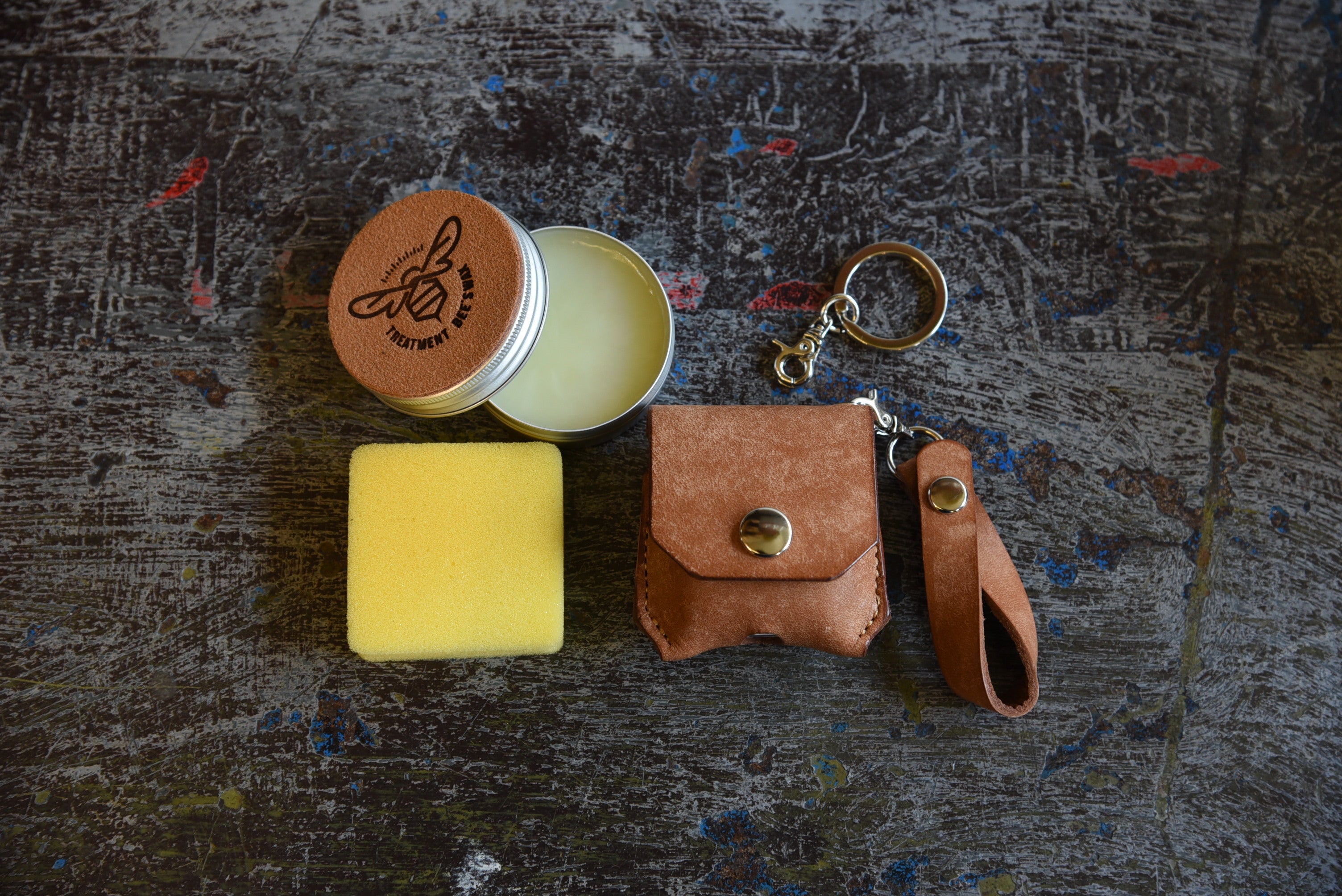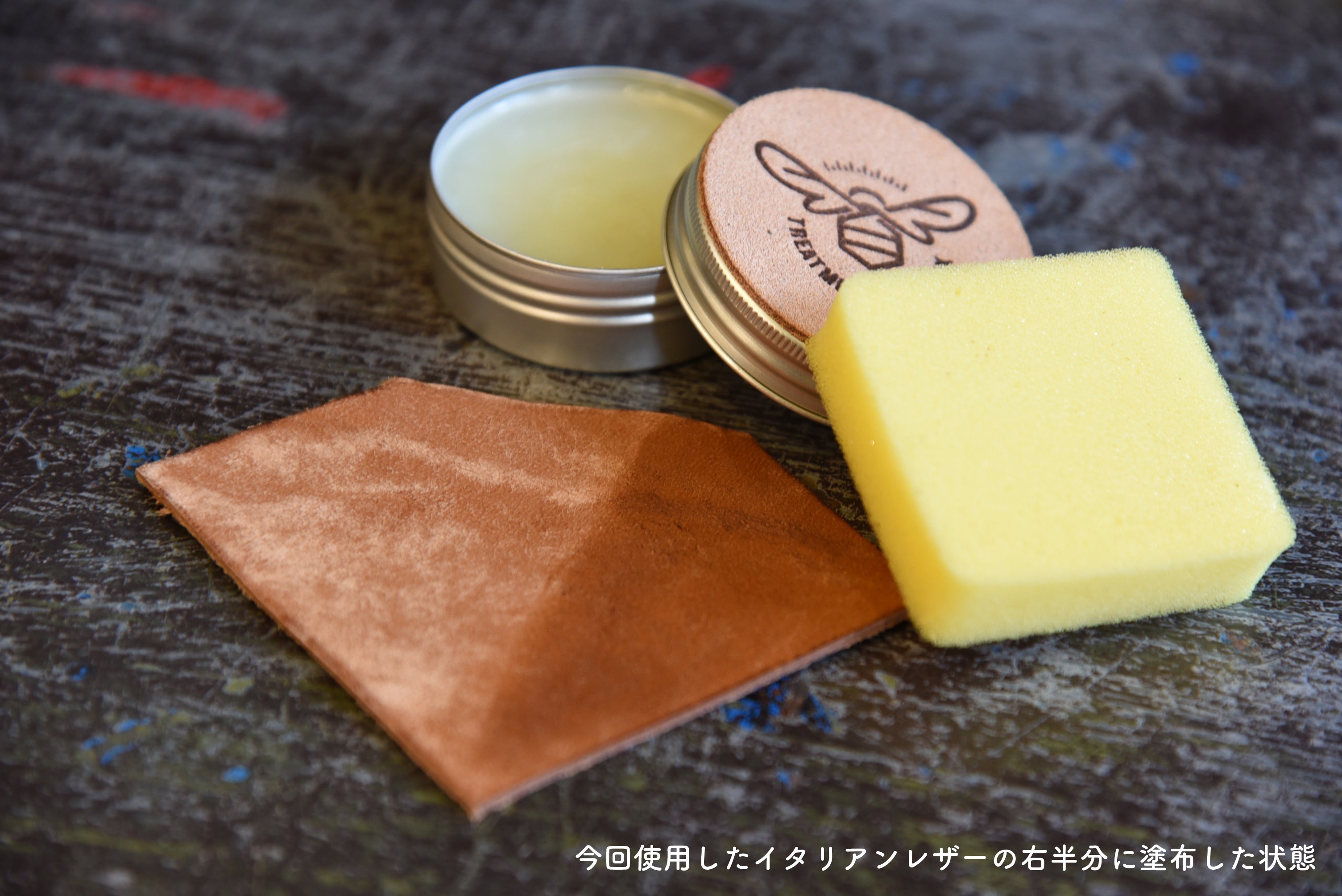 当店オリジナルデザインの蜜蝋ワックス30g(無香料)とスポンジがついた、経年変化をより楽しめる限定セットになります。