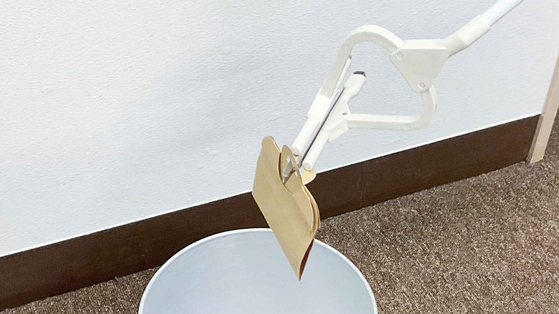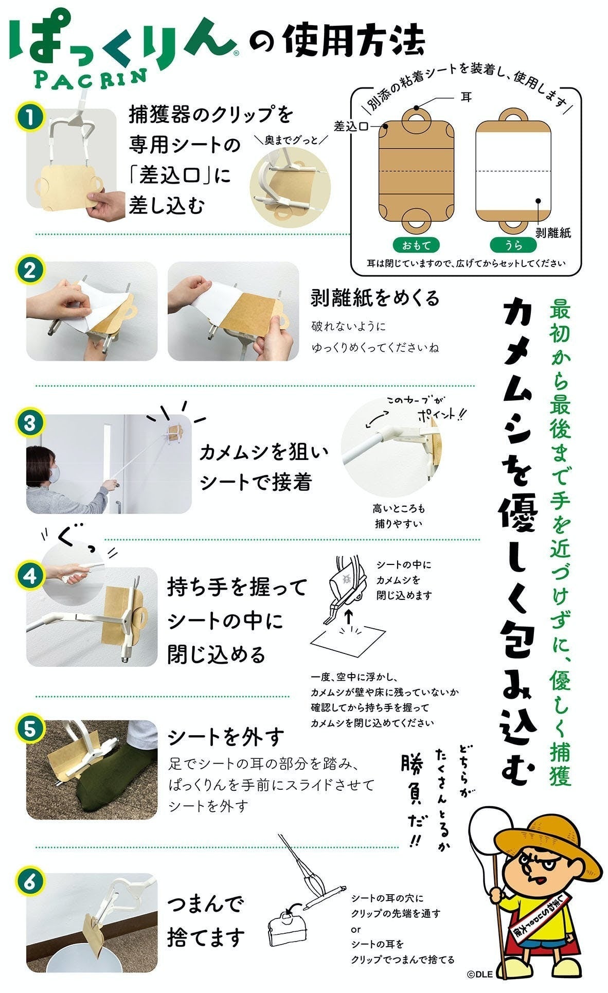 害虫捕獲器「ぱっくりん」とは、マジックハンドのような器具に粘着性のシートを装備し、害虫を後ろからひっつけ、ぱっと挟む道具です。