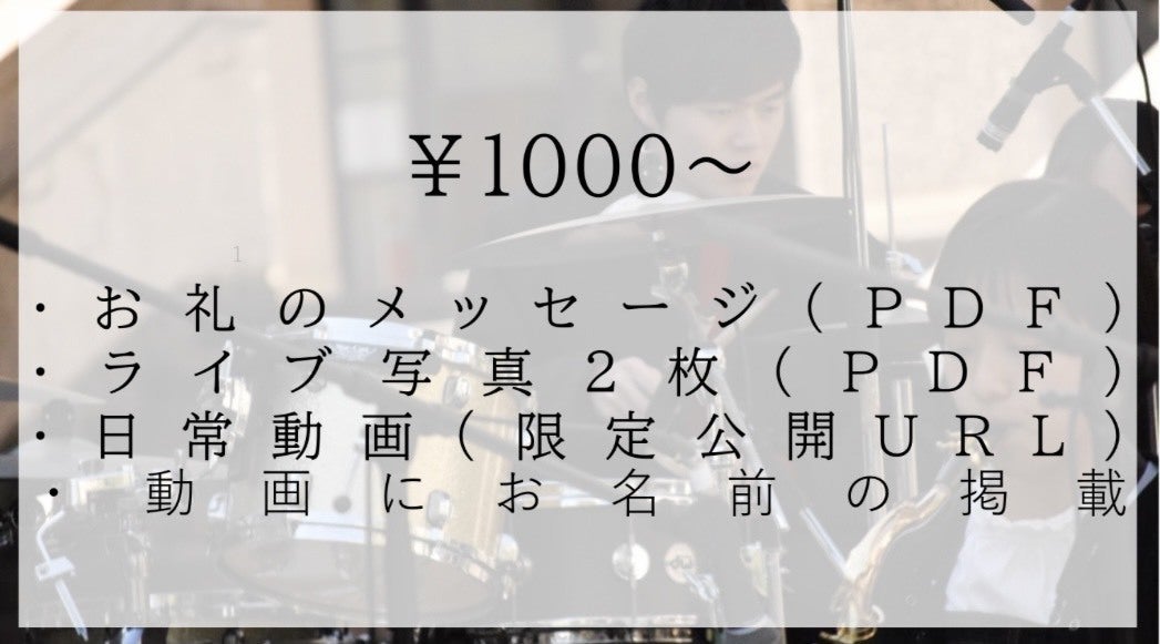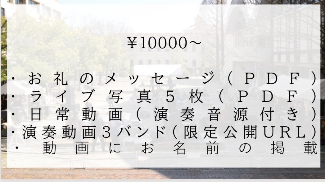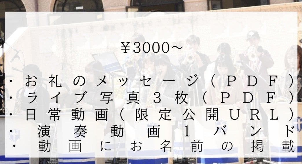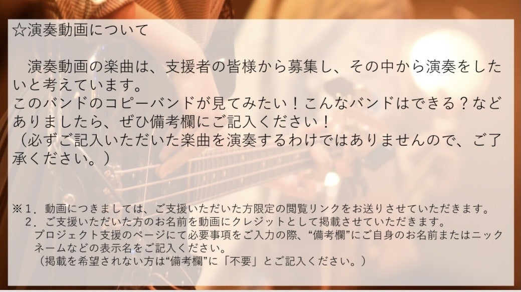 2022/03/29 21:53お世話になっております、文化総部軽音楽部です。クラウドファンディングのリターンについてご連絡させていただきました。今回のリターン内容といたしまして、①お礼のメッセージ ②ライブ写真 5枚 ③日常動画 ④演奏動画 3本 の4種類を、ご支援いただいた金額に応じて、お送りさせていただく形となります。随時、ご案内のメールをお送りいたしますので、ご確認ください。万が一、メールが届かない場合はお手数をおかけしますが、kglmc2021@gmail.com までご連絡ください。リターンについての説明は以上になります。いずれも内容の転載はお控えいただきますようお願いいたします。また、リターンのお届けが遅れましたこと、お詫び申し上げます。最後にはなりましたが、たくさんの応援やご支援、誠にありがとうございました。これからも、文化総部軽音楽部への変わらぬご愛顧のほど、よろしくお願いいたします。ご不明な点がございましたら、お気軽にご連絡ください。 もっと見る関西学院大学文化総部軽音楽部 活動報告#3