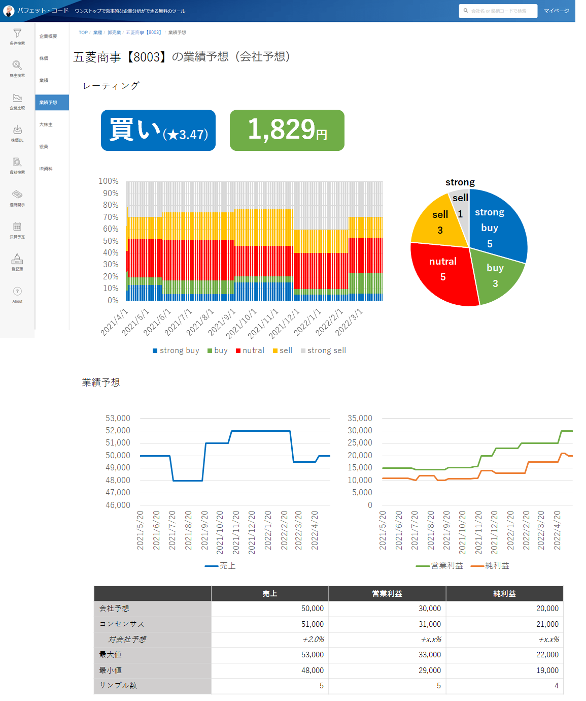 コンセンサスには売上予想、営利予想、純利予想、目標株価、レーティング(売り推奨か中立か買い推奨か)などがあります。