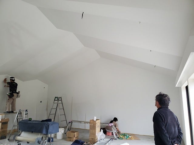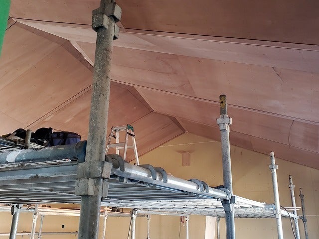 波打っている天井の形が見えてきました。死ぬほど重い?遮音ボードを天井に取り付けていく作業は大変らしく、大工さんご苦労様でした。