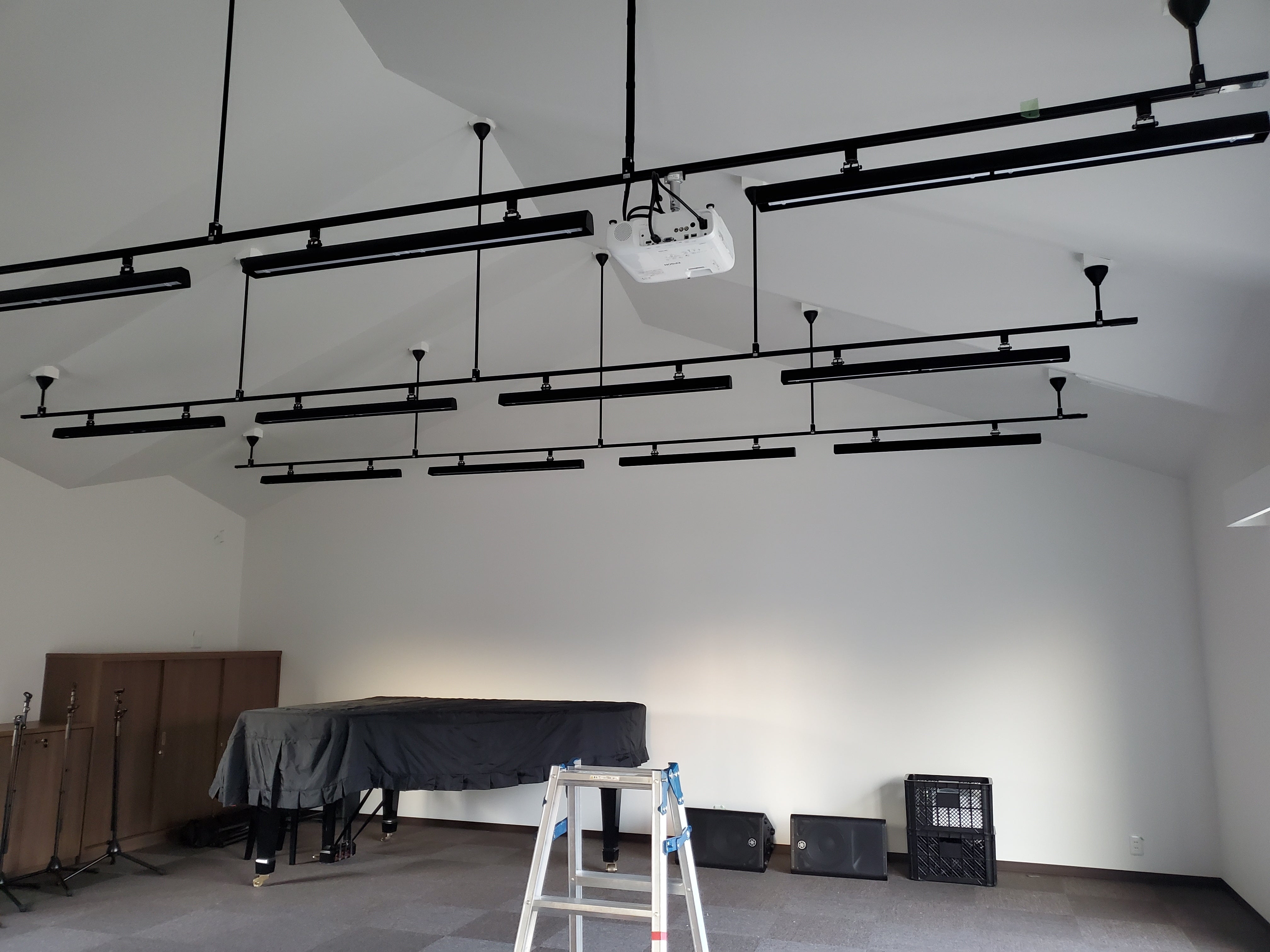 プロジェクターが付き、楽譜などを収める家具が搬入されました。音響、配信機材も整えています。