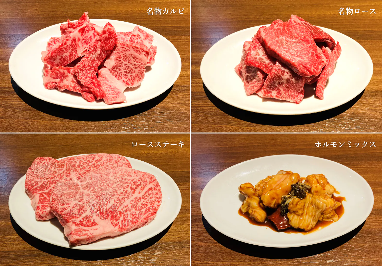 和牛名物カルビ (250g)、和牛名物ロース (250g)、ホルモンミックス味噌だれ (300g)、