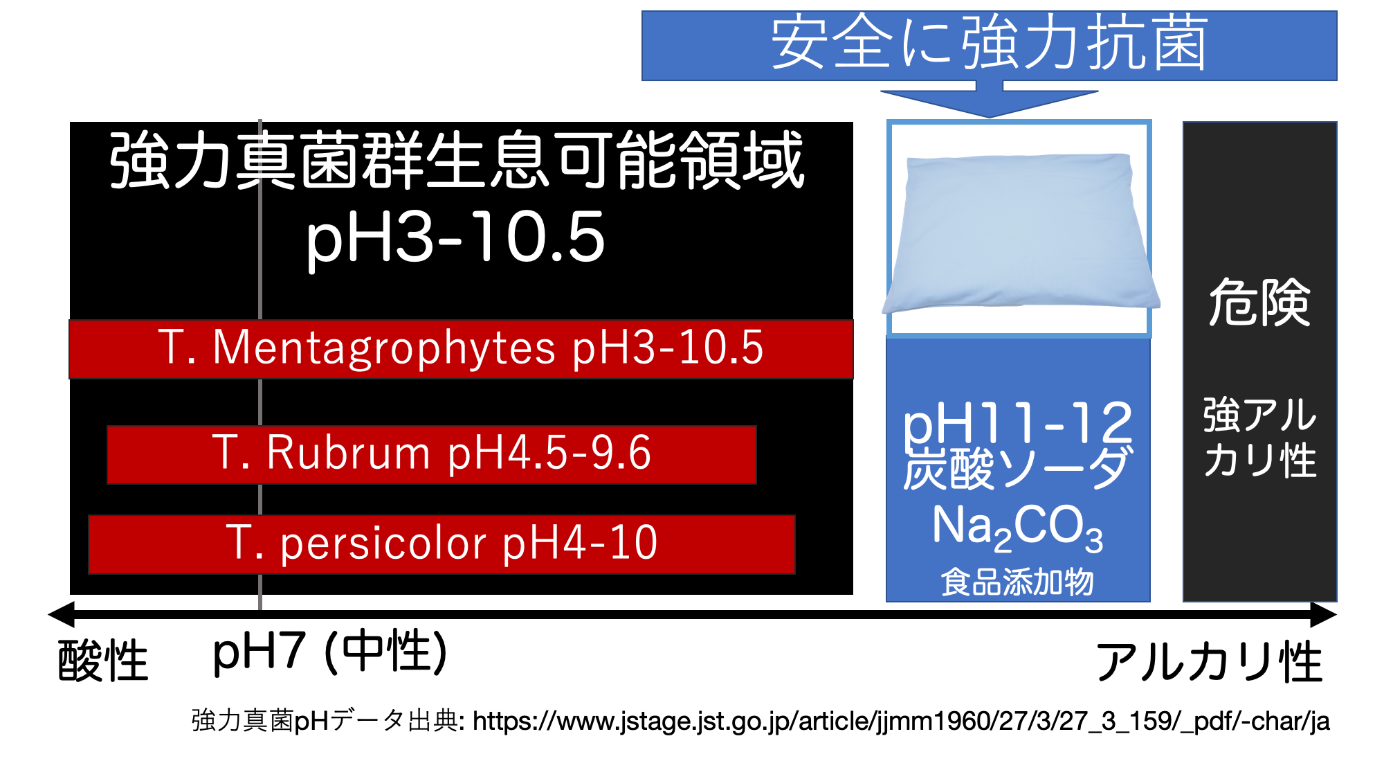 この範囲外にすれば防カビが可能ですが、強アルカリ性は、効果が高いものの、皮膚にダメージを与える危険があります。そこで、比較的低く、耐性が強い真菌でも生息ができない領域のpHとなる物質を調査検討した結果、
