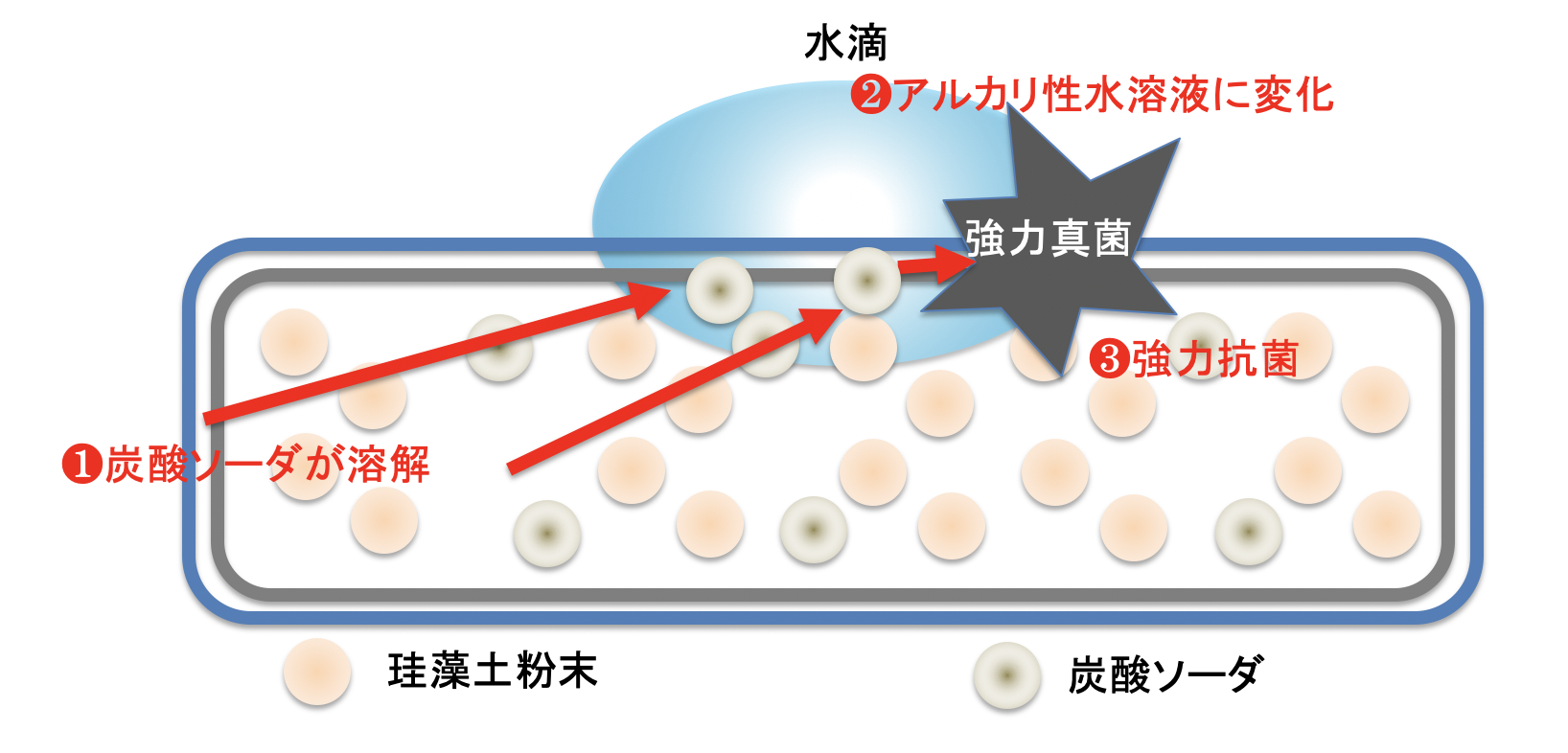 炭酸ソーダ(炭酸ナトリウム)が最適です。この炭酸ソーダをインナーに配合しpH11-12を実現すれば、優れた抗菌力を発揮することができます。
