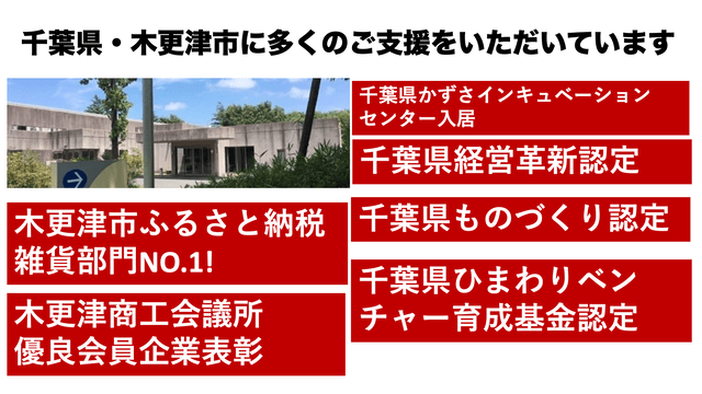 木更津市・千葉県の地域の方々から人的資金的に多大なるご支援をいただき、かずさインキュベーションセンターで、柔らか珪藻土等数々の新製品開発を実現し、マクアケでクラウドファンディングでご支援を募りました。