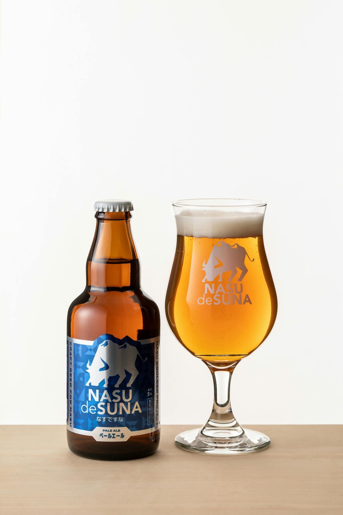 クラフトビール「なすですな」のベーシックな2種類(ペールエール、IPA)と、ロゴ入りグラスを1つお送りします!