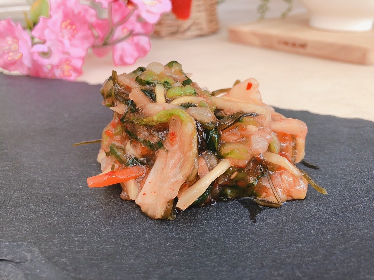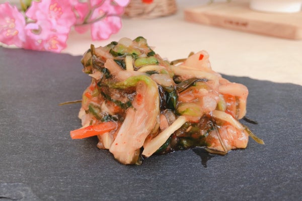 2度漬けした白菜浅漬をきざみ、ヤンニョンに昆布、生姜、野沢菜漬と一緒に漬け込みました。甘辛味と生姜の風味が食欲をそそります。