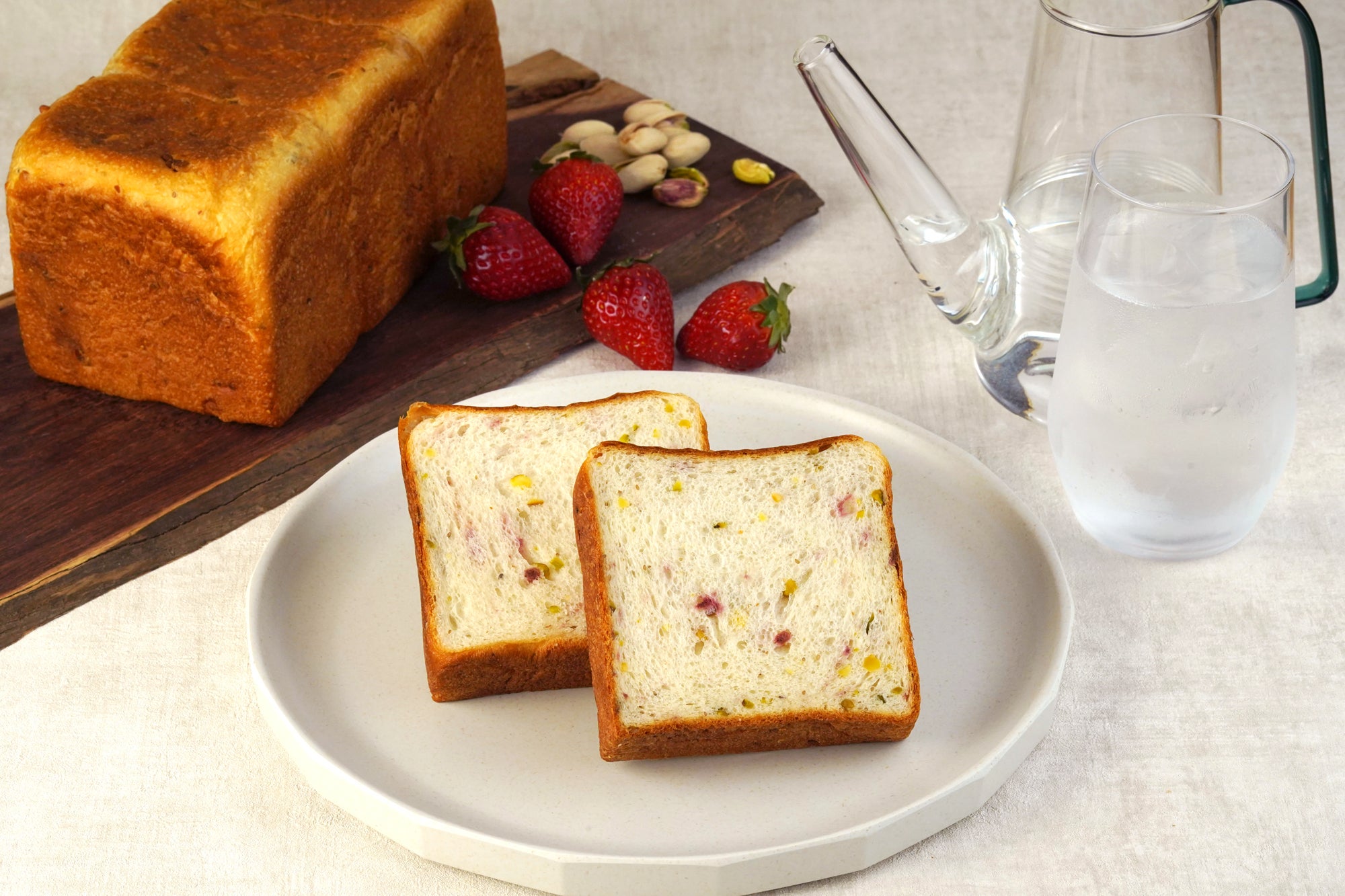 酸味のきいたフリーズドライのいちごとローストしたピスタチオをたっぷりと練りこんだ、見た目もかわいい食パン。栄養価の高いナッツとしてしられるピスタチオの歯ごたえと、ホワイトチアシードの食感がお楽しみいただけます。