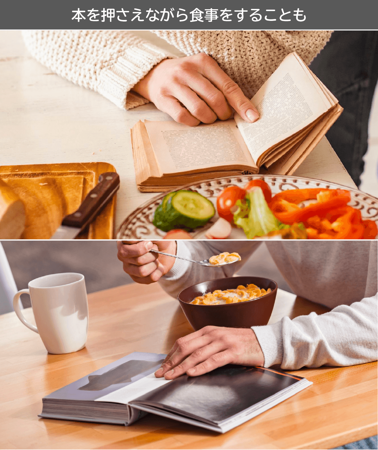 ブックスタンドとして使う時もそうですが、スタンドを使わずテーブルに開いて置いて読む際も、ページが閉じないように手などで本を押さえる必要がありません。ハンズフリーになるので、コーヒーを飲みながら片手でページをめくったり、読書をしながら食事や、メモをとることもラクチンにできます。