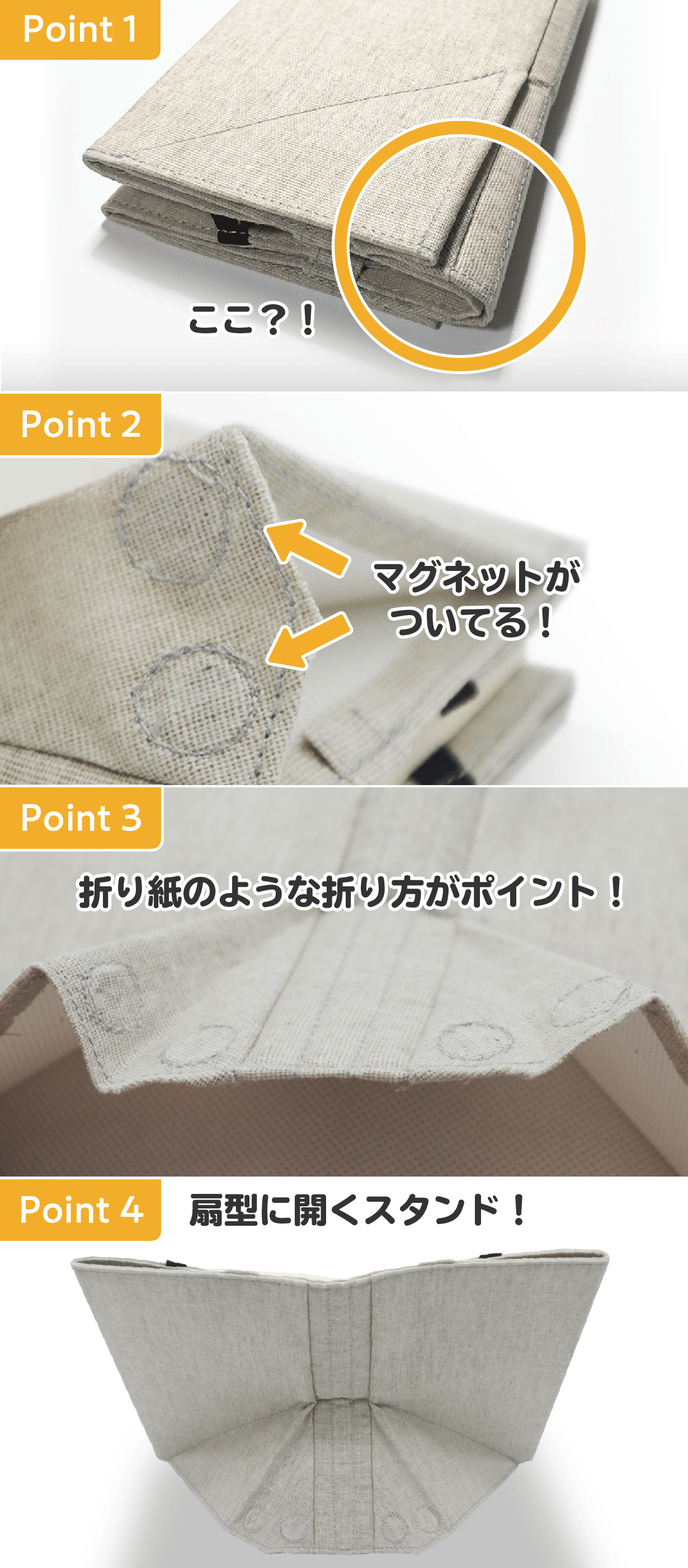 スタンド部分の仕組み「機能一体型ポータブルスタンド」「読みやすい角度の広がり」「コンパクトに収納できるスタンド」「スタンドの収納はマグネットで固定」「ページが閉じないようにしっかりホールドするバンド」など様々な工夫があります。そちらは「実用新案・知的財産権」の申請は日本、中国などで済んでおり、また、「ブックカバースタンド」という名称で国内にて商標登録の申請も済んでおります。