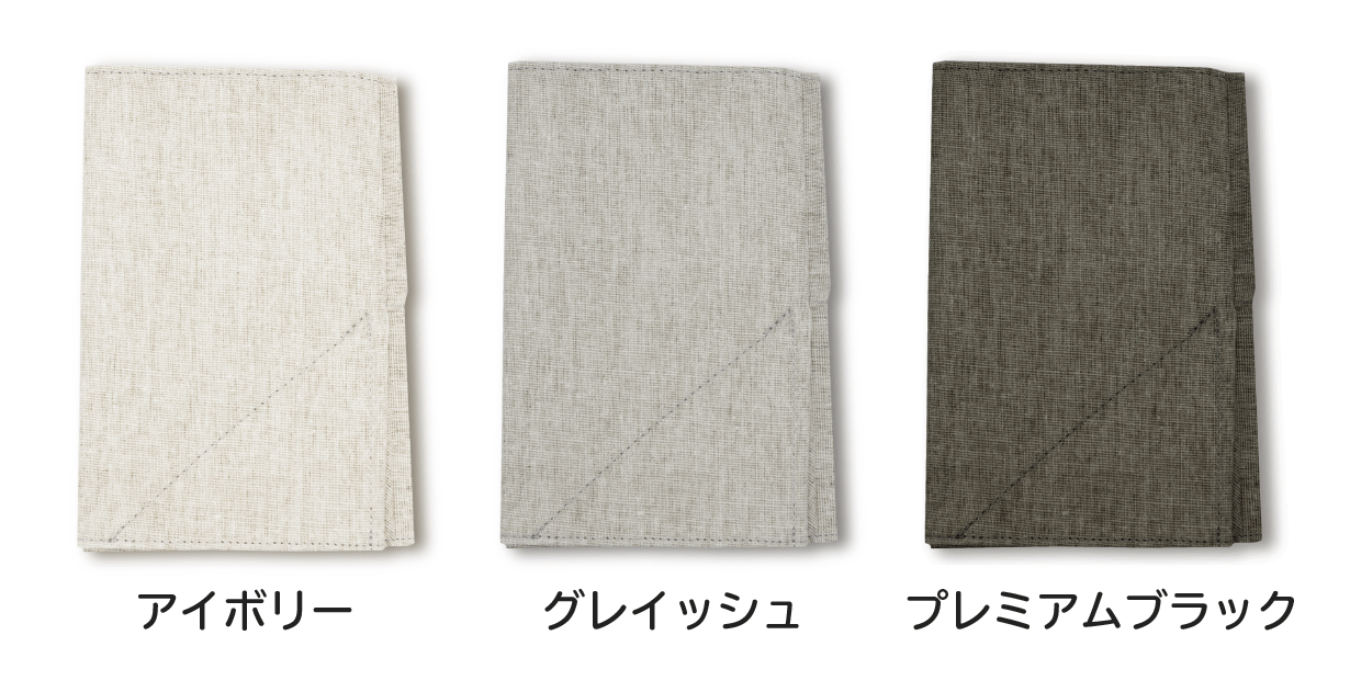 「アイボリー」「グレイッシュ」「プレミアムブラック」の3色からお選びいただけます。「プレミアムブラック」のみ、少し渋さを出すために他の二色と生地を変え、違いを出しました。担当者(わたし)的には、男性には「プレミアムブラック」がおすすめです(笑