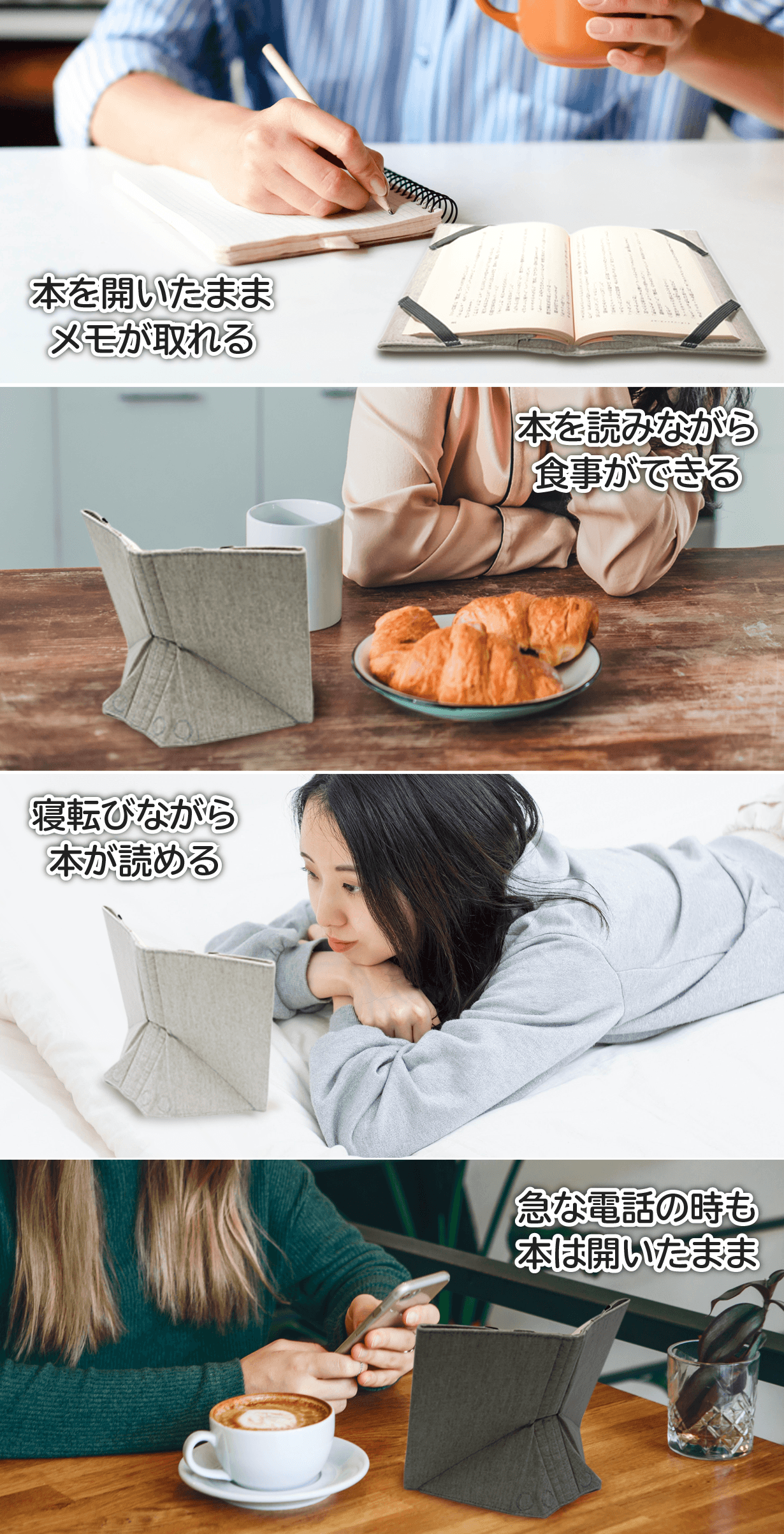 片手や両手で本を持ちながら読書をしていてとっさに何かをするときがしばしばあると思います。その際に本を閉じたり、しおりをはさんだり、またメモを取りたいときに肘や別のモノで本を押さえる等、読書をしているときに何か他のことをすることに不便さを感じた経験をしたことはありませんか。
