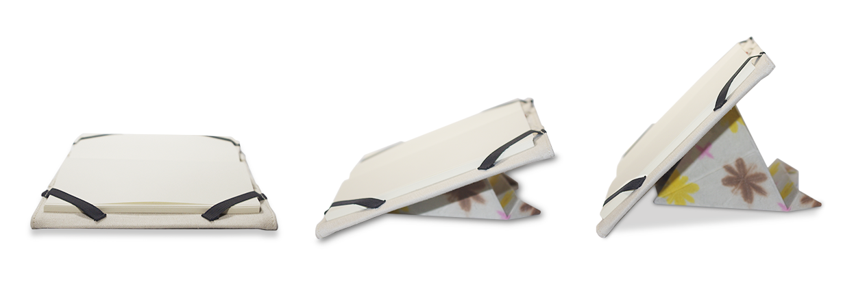 ブックカバーがブックスタンドに早変わり。他のツールをブックカバーに装着する必要はありません。ブックカバーからブックスタンドにするには底辺の部分を開くだけ!