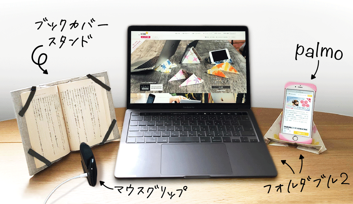 「ECBBブックカバースタンド」を使ってブックスタンドとして本を開き、フォルダブル2をスマホスタンドやノート型パソコンのスタンドとして利用し、先日BOOSTERでも販売されていたマウスグリップをつかえば快適なリモートワーク環境が構築されるはずです。