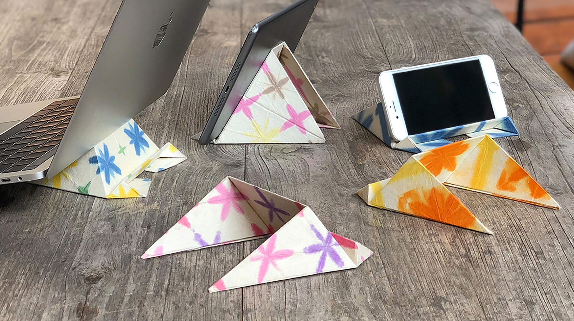 フォルダブル2は、ECBBプロダクトの一つでぬくもりを感じる和紙でつくられた折り紙のように折って使うモバイルスタンドです。折り方を変えることで2種類の使い方ができます。色は6種類あります。