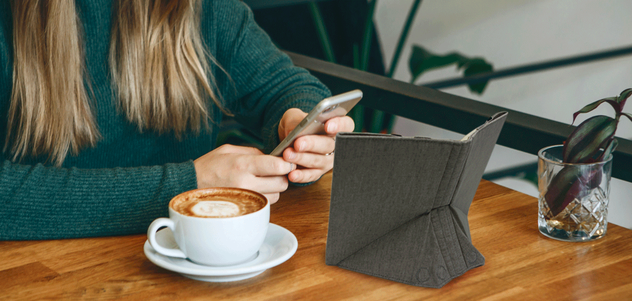 ノート型パソコンのスタンドにフォルダブル2を使うとキーボードが打ちやすく手に負担がかかりにくくなります。また、スマホはフォルダブル2をスタンドにして見える位置に立てておけば、急な電話や通知の見落としもありません。