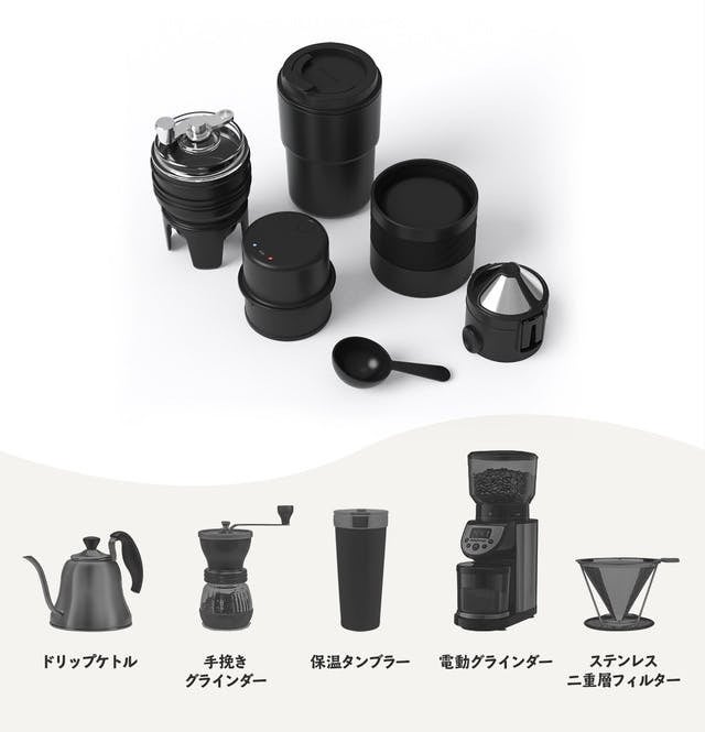 こちらはモーター、グラインダー、手挽きグラインダー、ケトル、タンブラー、蓋、フィルター、ドリッパー、ケースが入っているフルセットになります。お好みに合わせて手挽きでも電動でも楽しめるようになっています。