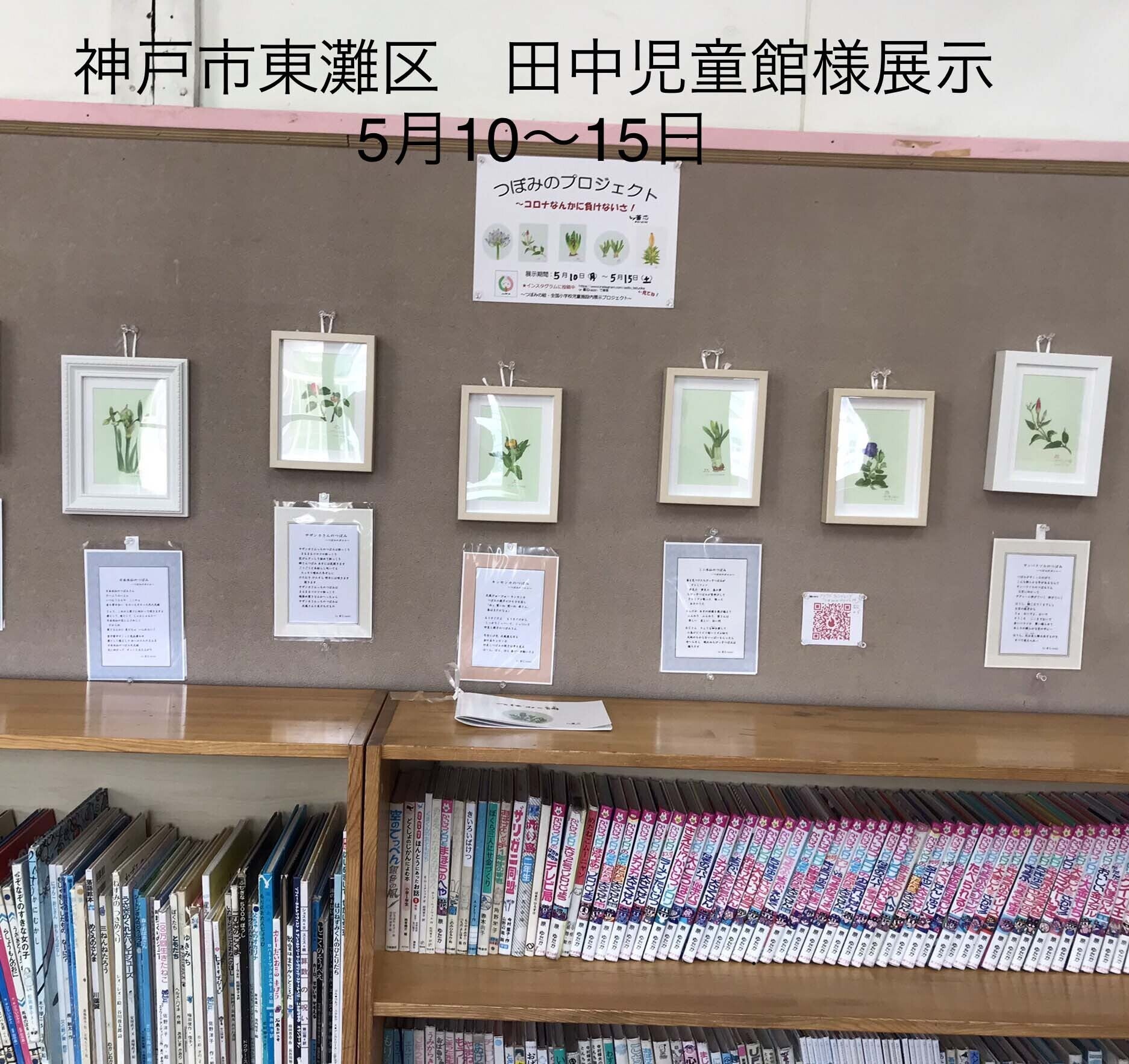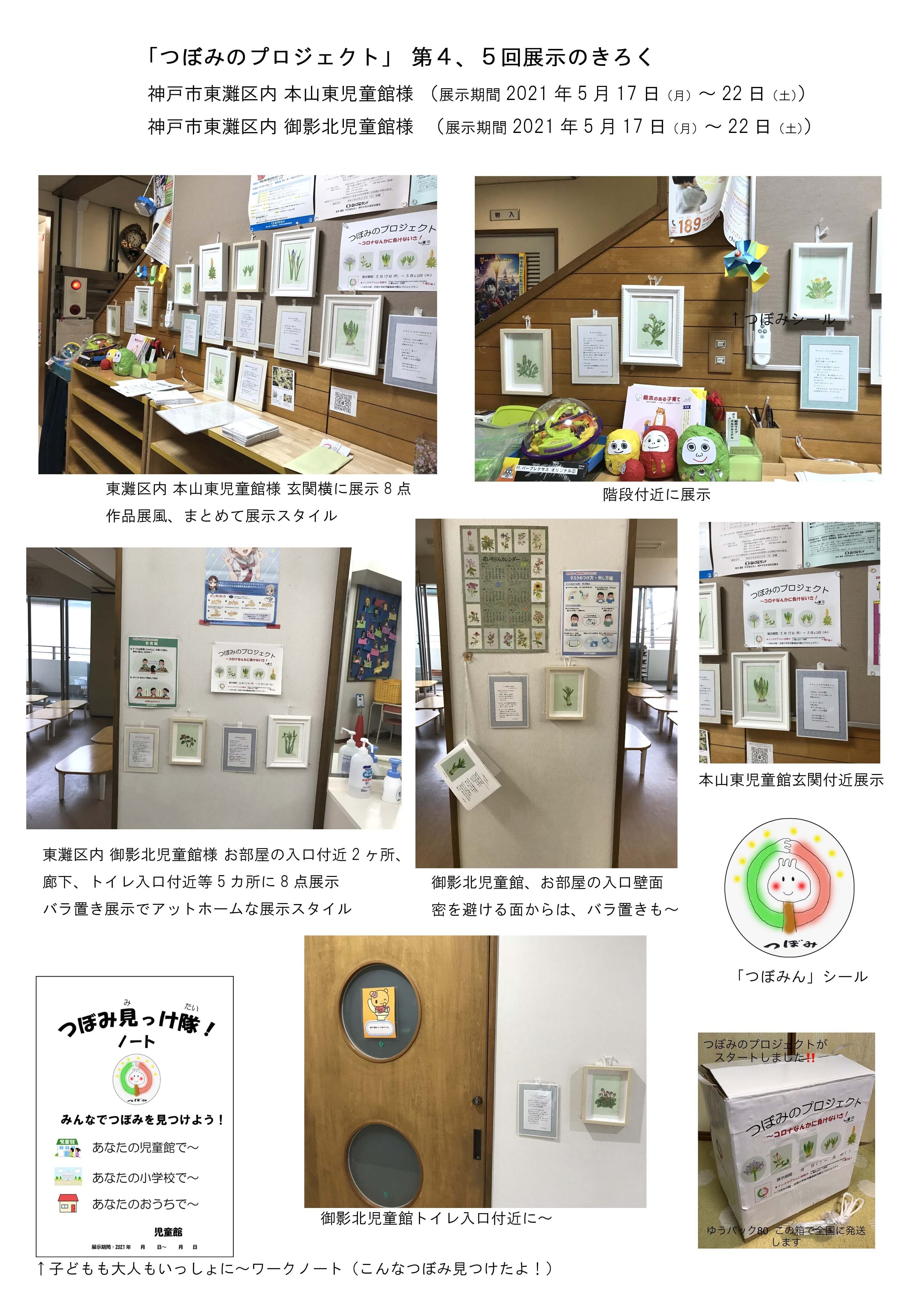 第4回展示:神戸市東灘区本山東児童館様 子どもたちが必ず通る、玄関付近に8点。集約的な展示。展示作業中も男の子が興味を持って話しかけてくれる。第5回展示:神戸市東灘区御影北児童館様 広い館内のお部屋の入口付近壁面に3点、廊下に1点、トイレの横に1点、階段付近に3点展示。バラ置き展示で「おや、何かな!?」と気付いてくれたら~ バラ置き展示でアットホームな展示空間。