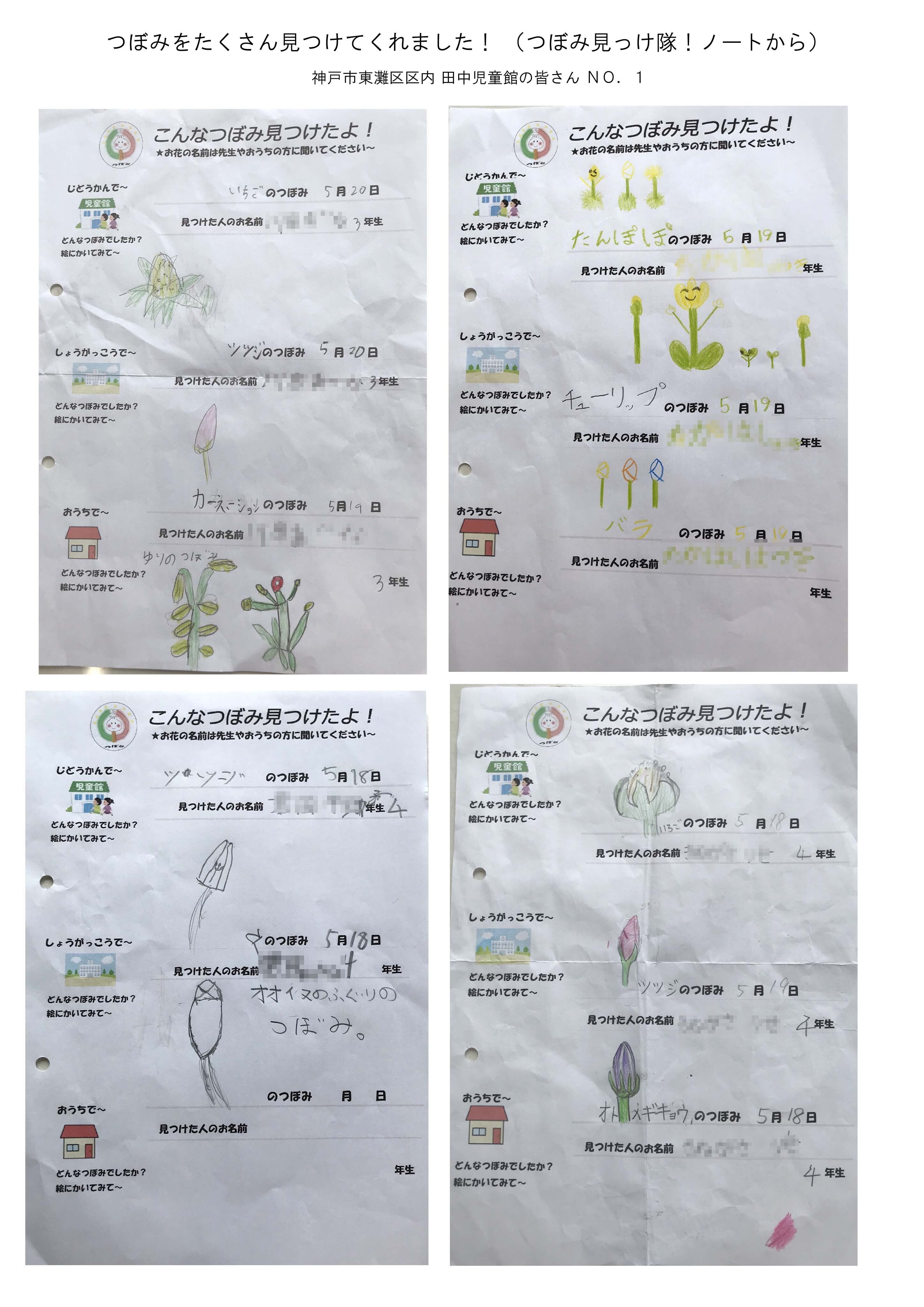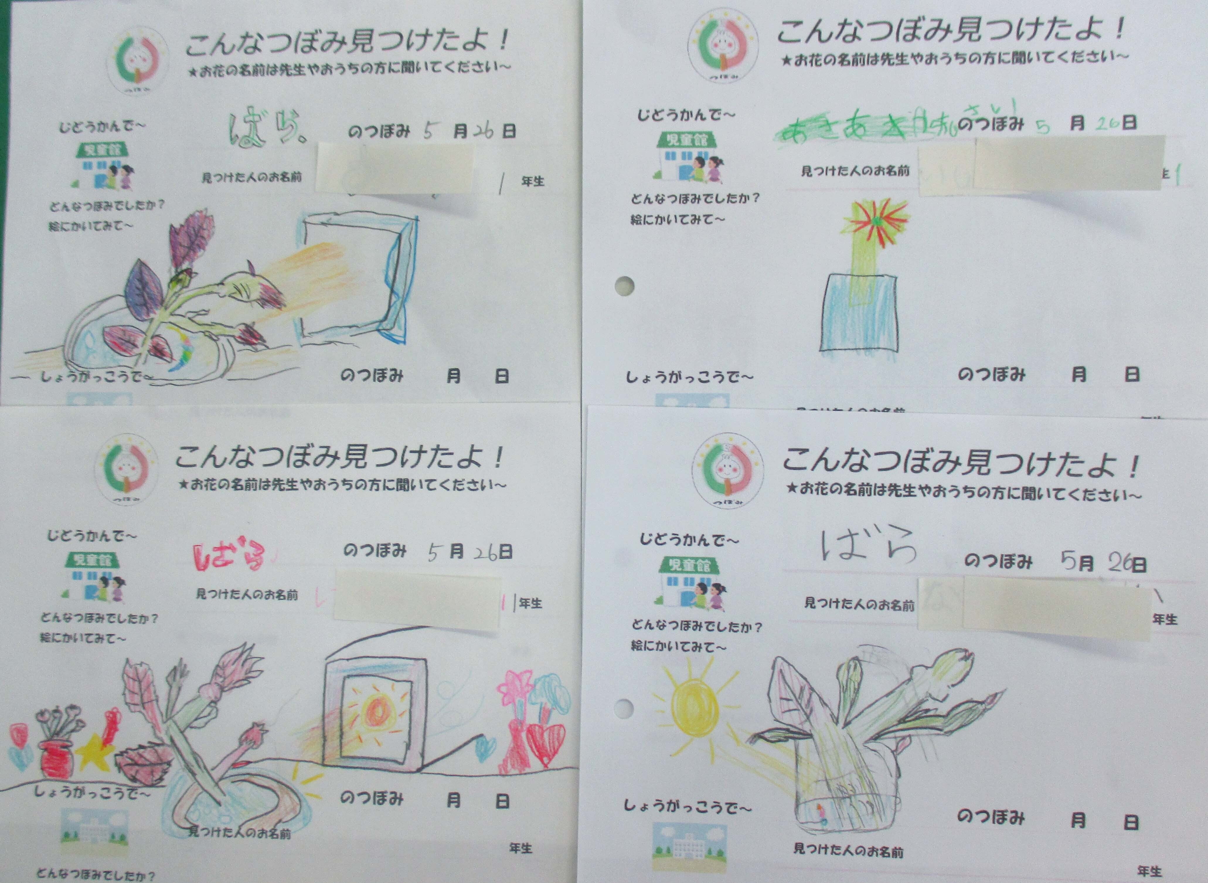 つぼみの絵8点とポエムの展示その他に・・・つぼみ見っけ隊!ノート B5サイズ楽しいつぼみをたくさん見つけてくれました!!田中児童館の子どもたちの絵(一部)