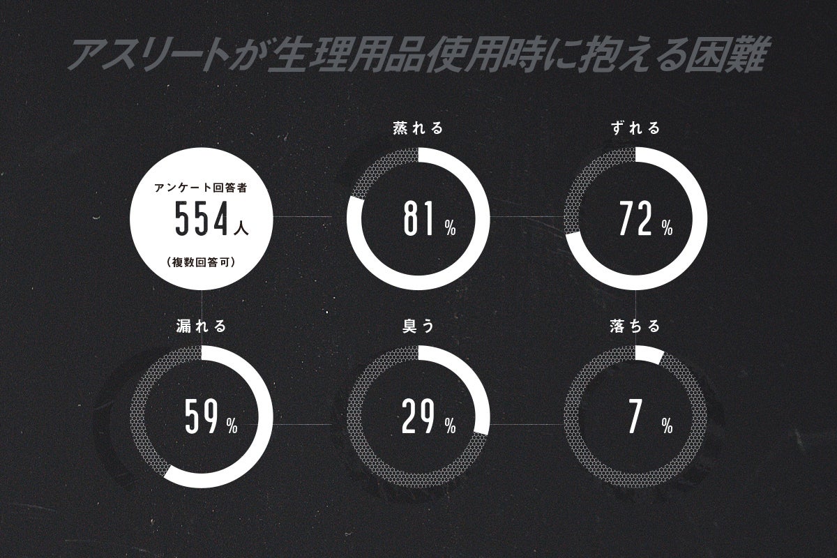 上の図は、アスリート554人へのアンケートです。回答者の97%(537人)が、生理用品使用時に何らかの困難を抱えていることが明らかになりました。アンケート結果にもある「蒸れる/ずれる/漏れる/臭う」は、スポーツのフィールド以外でも悩んだことのある人が多いのではないでしょうか。