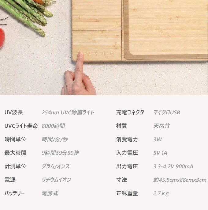 まな板のスケール/タイマー側の左側に小さなマイクロUSB充電ポートがあります。右側のスクリーンのバッテリーバーが10〜20%程度に下がったら、3時間充電するだけで、完全に充電されます。