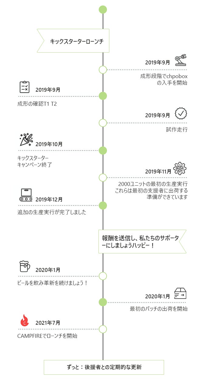 金型修正段階は現在完了しています。 現在、量産段階にあります。 CAMPFIREキャンペーンが終了した後、CAMPFIREプラットフォームから調達した資金を受け取り次第、発送段階に移行する予定です。 金型は最終形態であるため、試作段階を回避し、直接発送段階に移行することができます。 そのため、Chopboxは予定どおり遅滞なく発送されます。