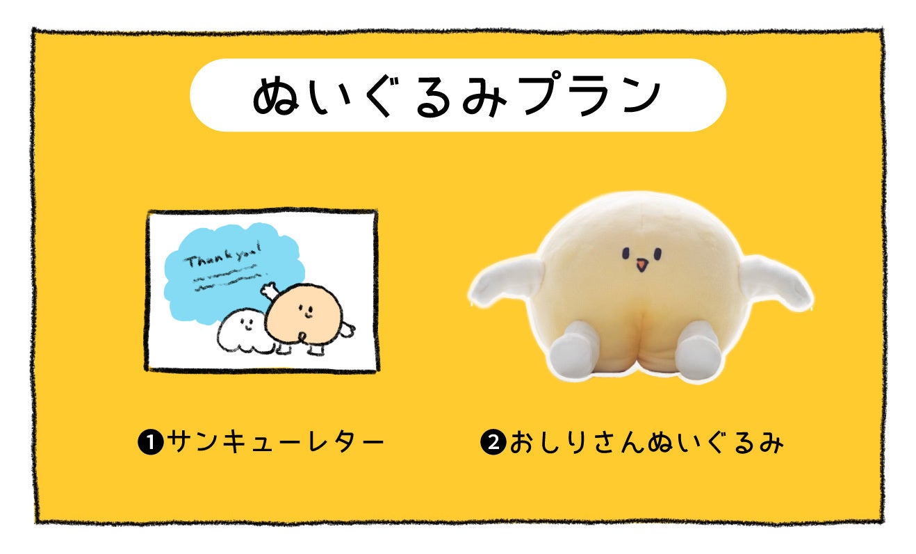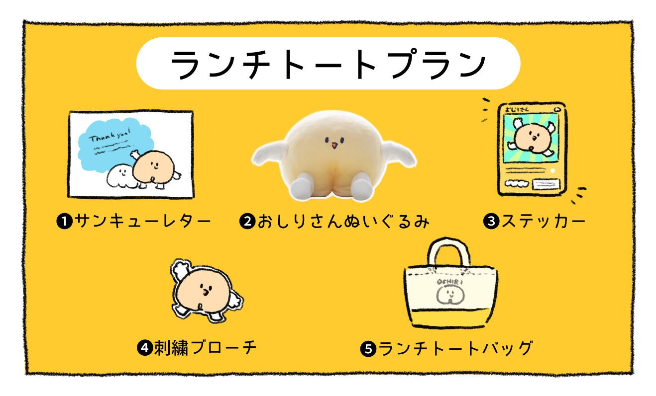 おしりさんぬいぐるみに加え、クラウドファンディング限定のグッズが届く盛り沢山なプランです!
